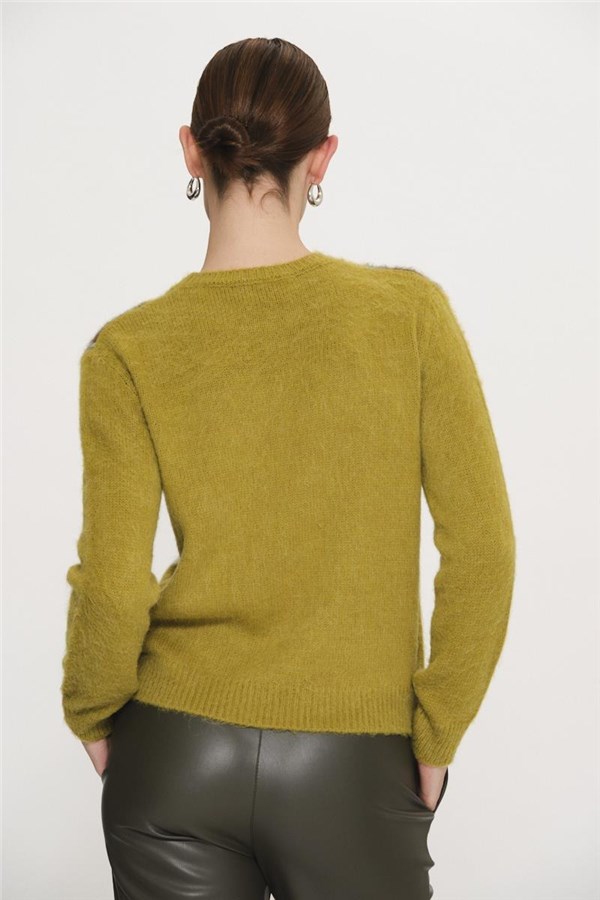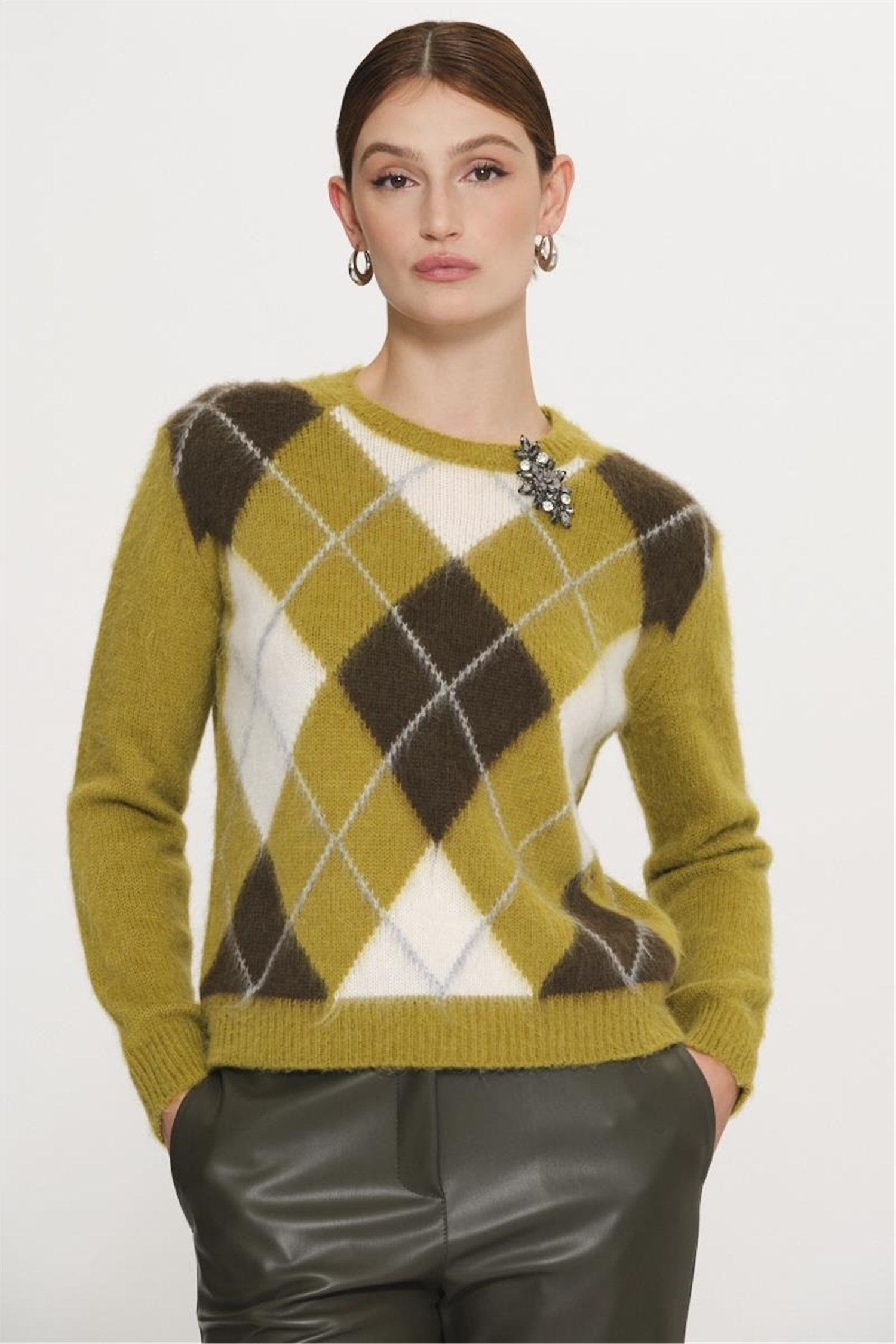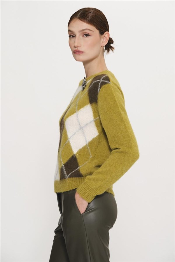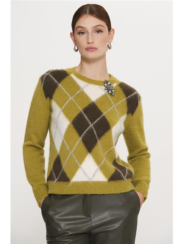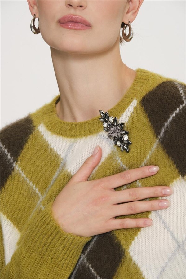Maglia a fantasia a rombi a contrasto colore nella parte frontale e con applicazione di spilla gioiello completamente rimovibile, girocollo, manica lunga, rovescino su collo, polsi e fondo.