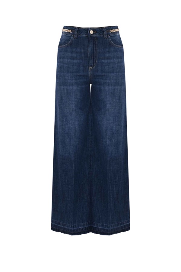 Perfetti per un look casual chic, questi pantaloni in denim di cotone a gamba larga sono impreziositi dal dettaglio di catene dorate che strutturano la vita. Questo modello presenta la piega stirata, tasche, chiusura con zip nascosta e bottone logato.