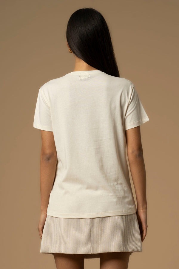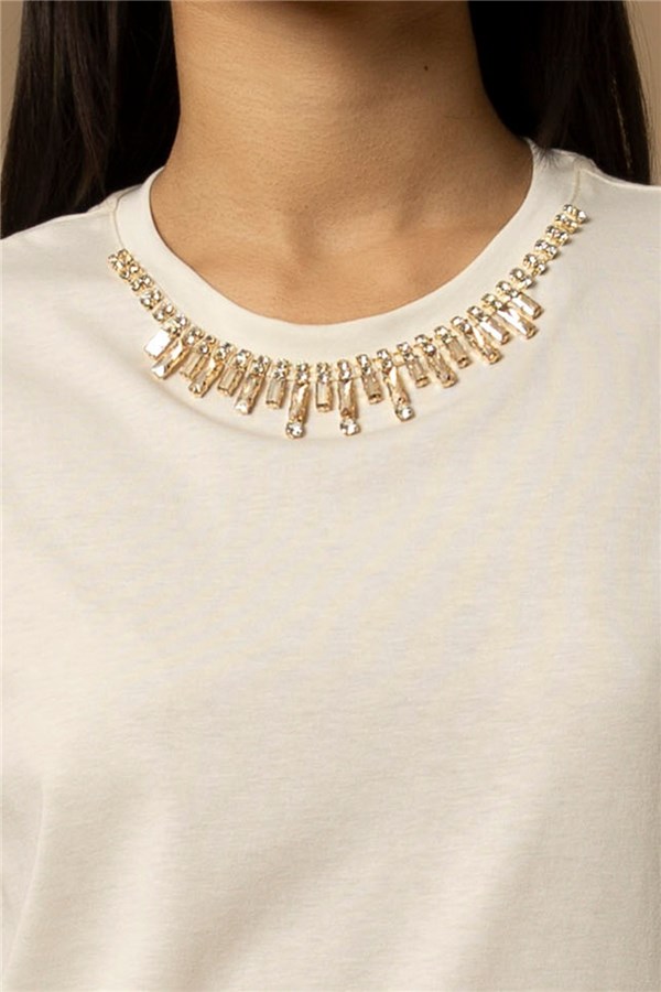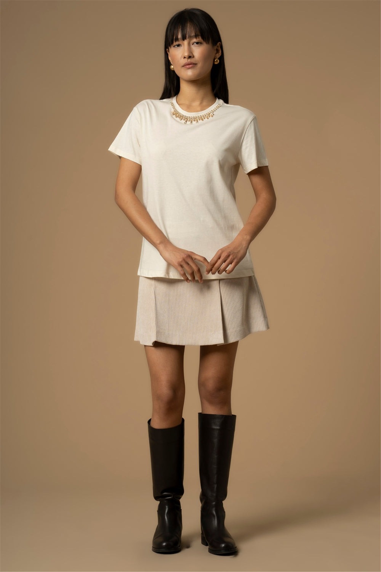 Versatile ed elegante, questa t-shirt a maniche corte è impreziosita dallo scollo rotondo con ricamo in pietre e strass. Il modello presente taglio dritto e vestibilità regolare.