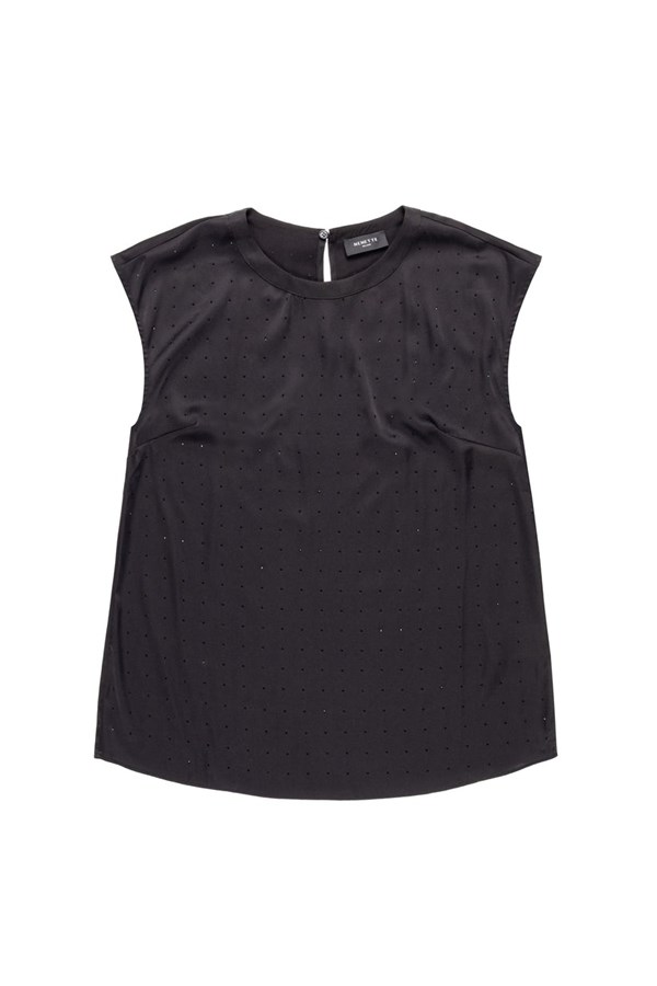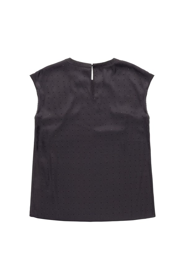Blusa senza maniche in raso con full strass, luminosa e raffinata. Il tessuto fluido si unisce alla brillantezza dei dettagli. Perfetta per look da sera o occasioni speciali, dona un tocco elegante e contemporaneo.