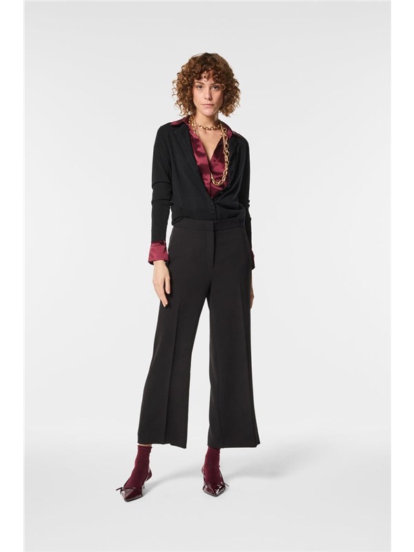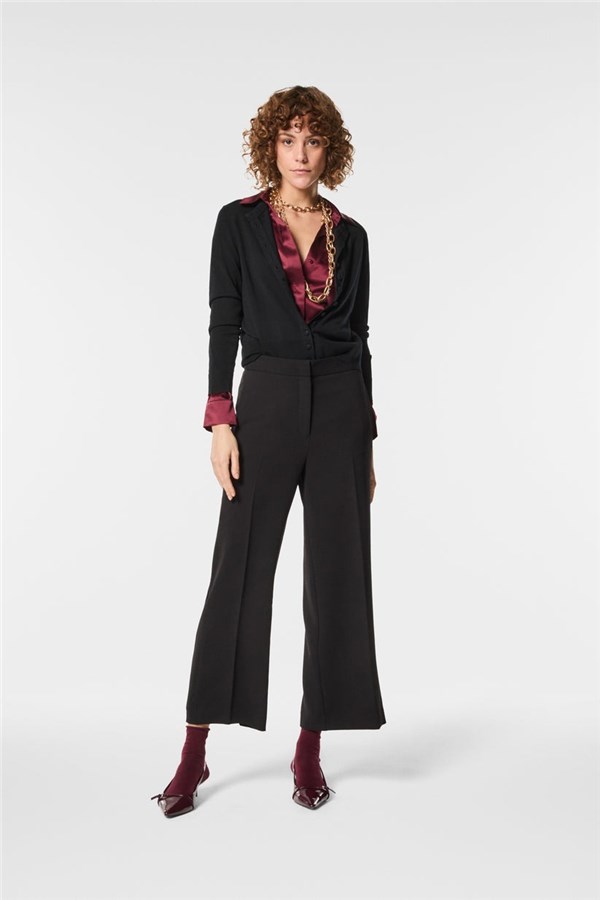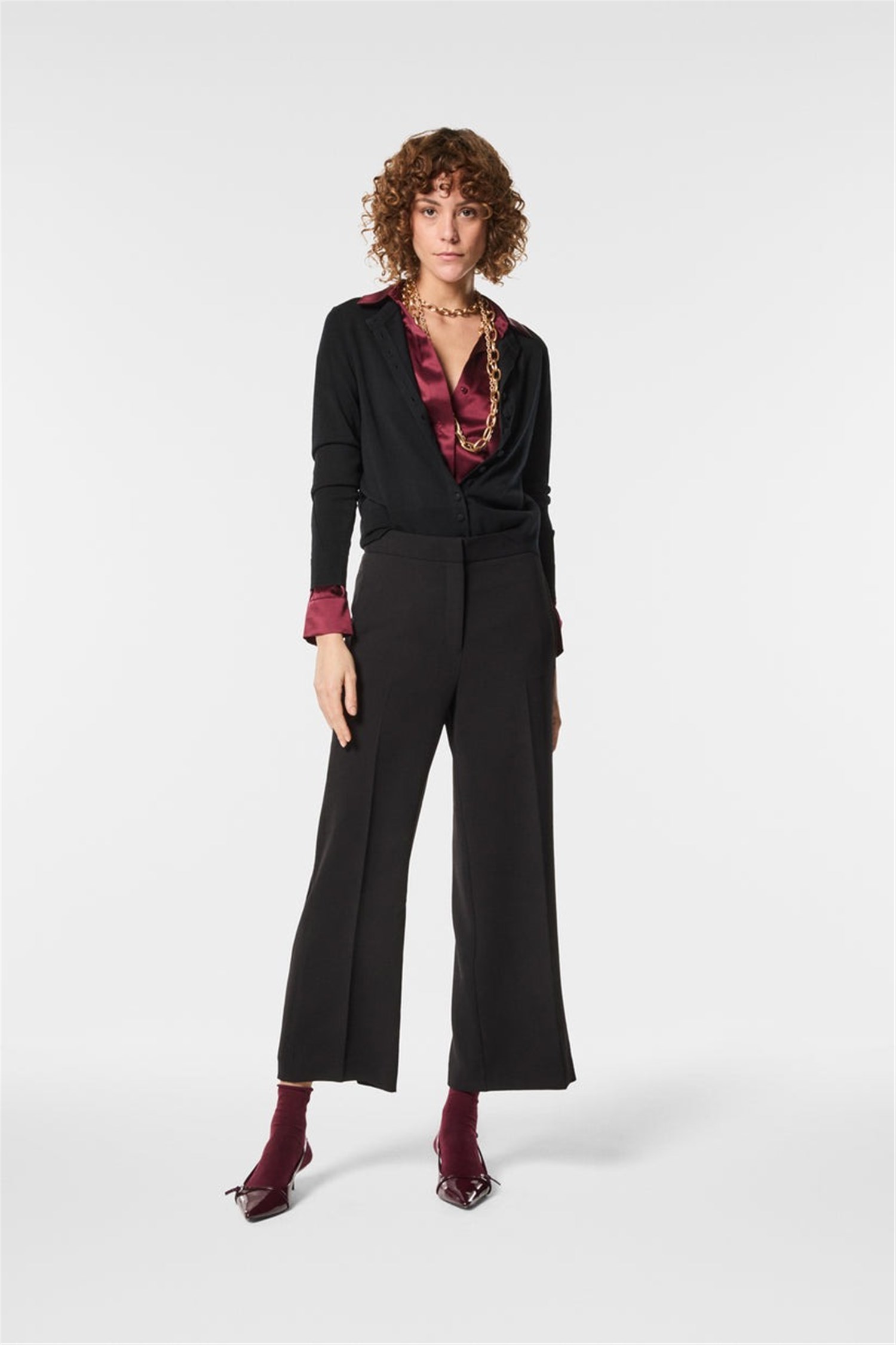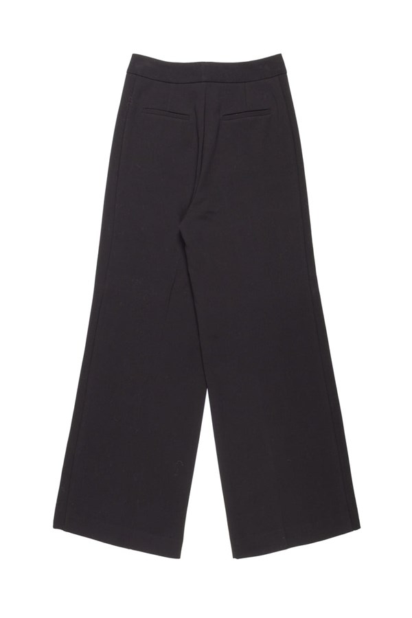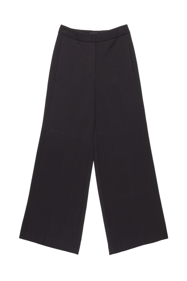 Pantalone a gamba larga in doppio crepe, dalla linea fluida e sofisticata. Il tessuto strutturato assicura caduta perfetta e comfort, valorizzando la silhouette con eleganza. Un capo versatile e senza tempo, ideale per look formali o outfit quotidiani dal carattere raffinato.