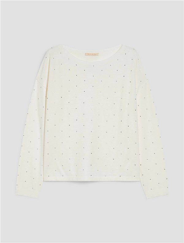 Un pizzico di glamour può dare una svolta al look: ecco la maglia dal design pulito, arricchita da micro-borchie scintillanti.