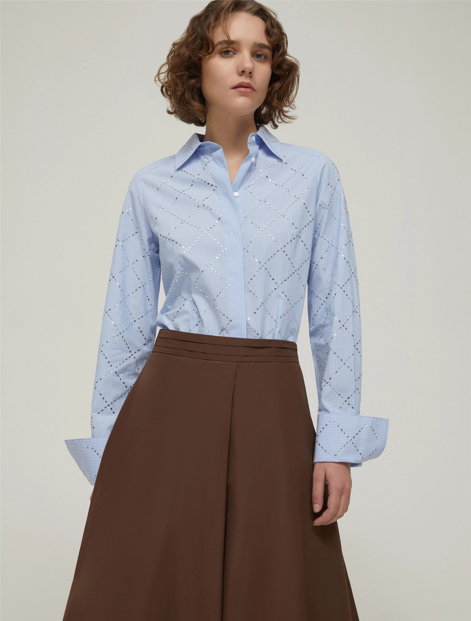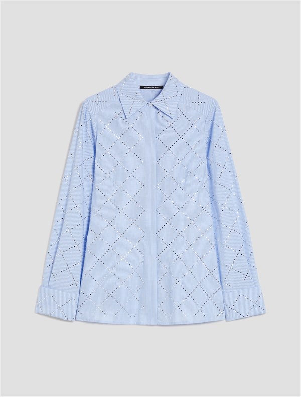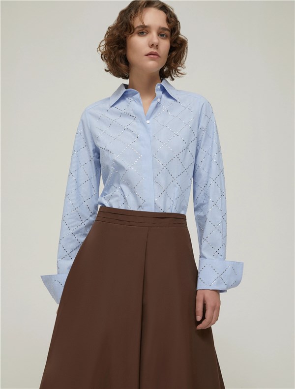 La camicia maschile diventa glam: ridisegnata con una silhouette femminile, è arricchita da un disegno a rombi composto da piccoli strass.