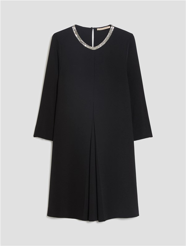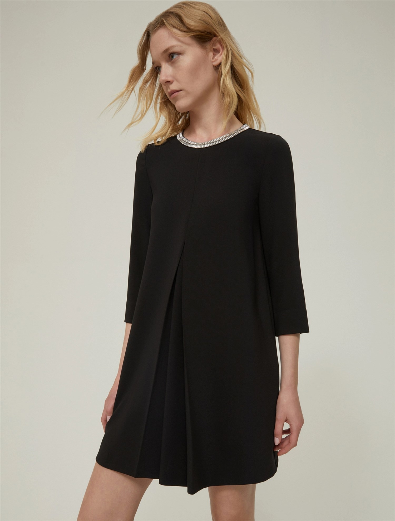 Chic assoluto: l’abito in cady varia la purezza minimal del suo design con il tocco glam di un girocollo scintillante – e il dettaglio non passerà inosservato.