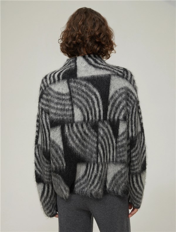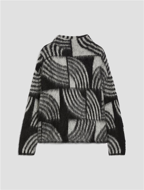 Extra soffice, ad alto tasso di stile: la maglia oversize in mohair blend trasforma in sapienti lavorazioni jacquard i pattern creati per Pennyblack dall’artista britannica Eloise Renouf.
