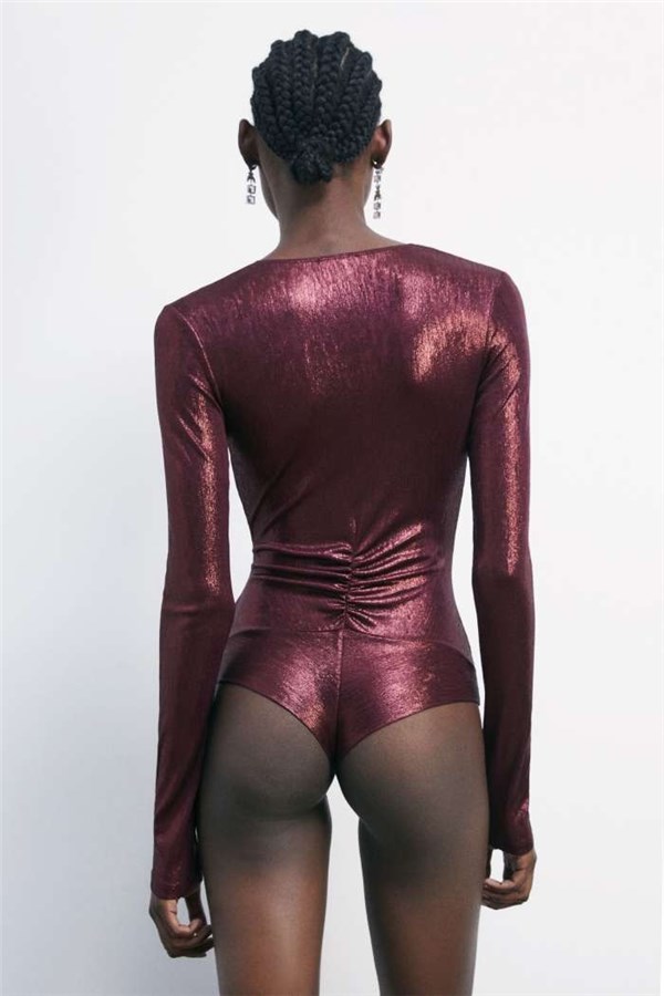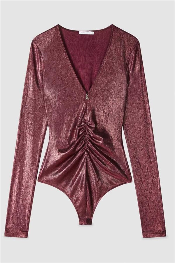 Body a maniche lunghe in jersey laminato dal finish iridescente, pensato per scolpire la silhouette. Lo scollo profondo e le pieghe frontali creano un drappeggio fluido. Abbinalo a un denim nero per un look glam-rock che gioca con i contrasti.