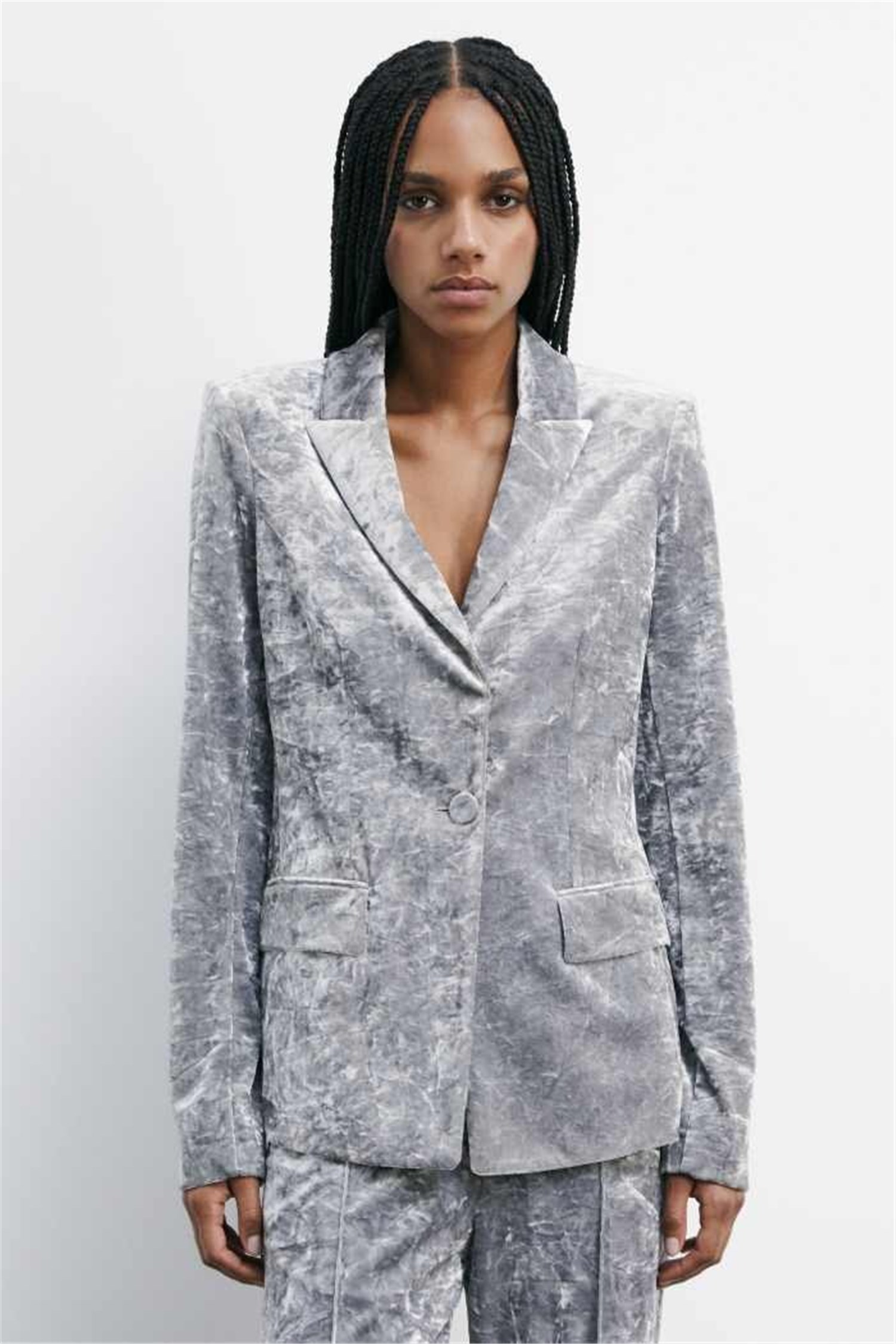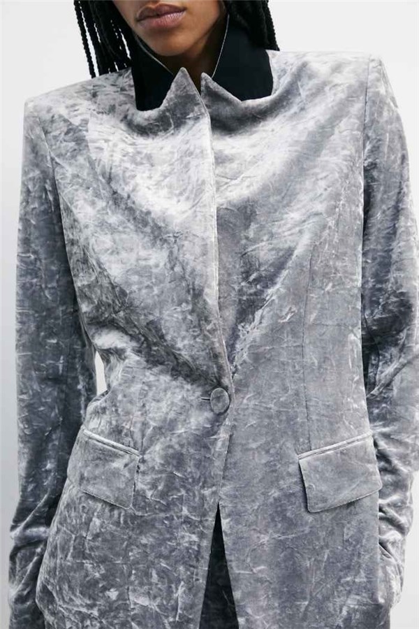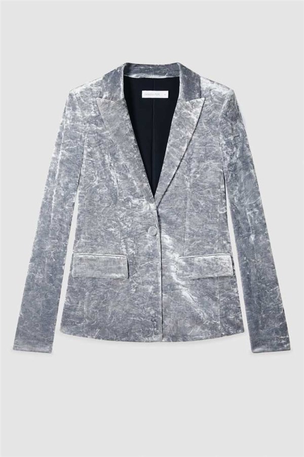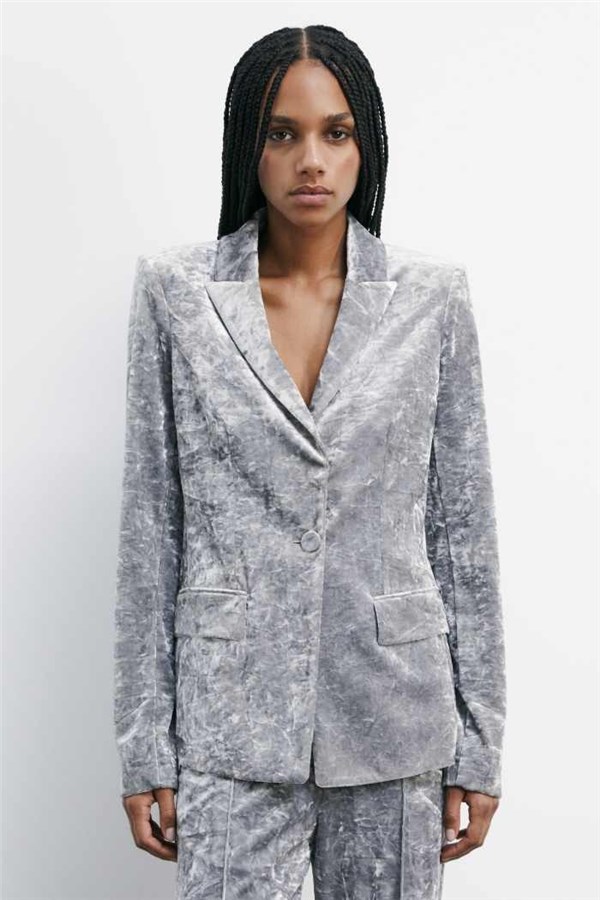 Blazer a un bottone della linea "ESSENTIAL", realizzato in velluto con finitura shiny. Morbido e d'impatto, crea un total look Festive Time luminoso con i pantaloni palazzo coordinati.