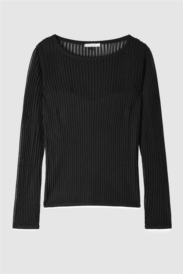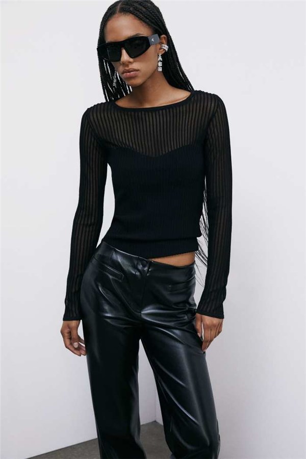 Maglia finissima a costine, lavorata con maestria per un sofisticato effetto see-through con trasparenze sensuali e dettagli grintosi, modellando la silhouette come un corpetto. Perfetta come layer per outfit invernali, si abbina a capi in tessuto spalmato per look glam rock ma anche sotto giacche over per un contrasto deciso.