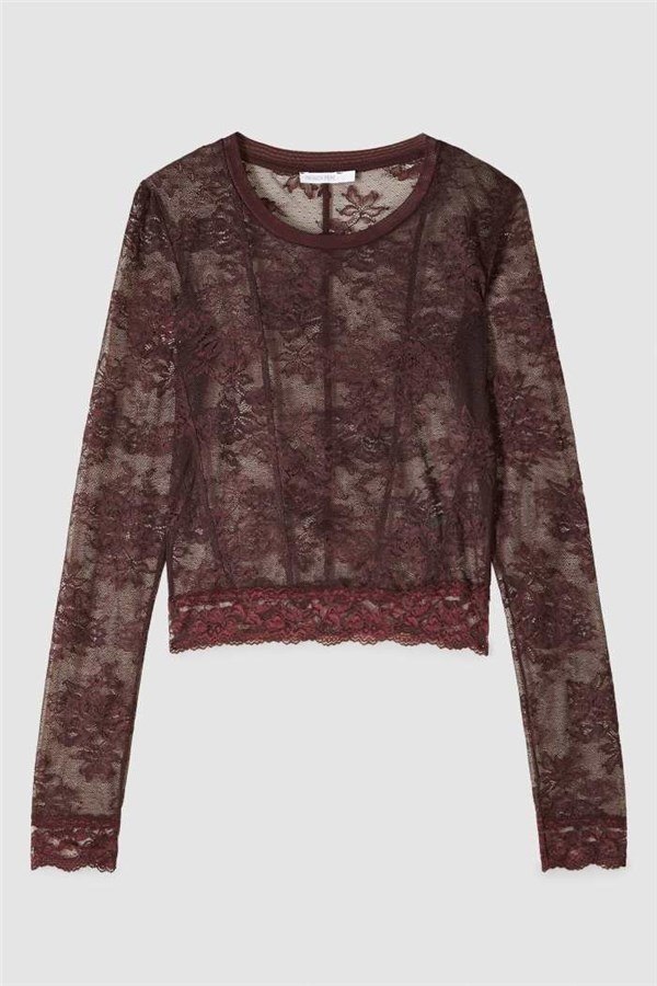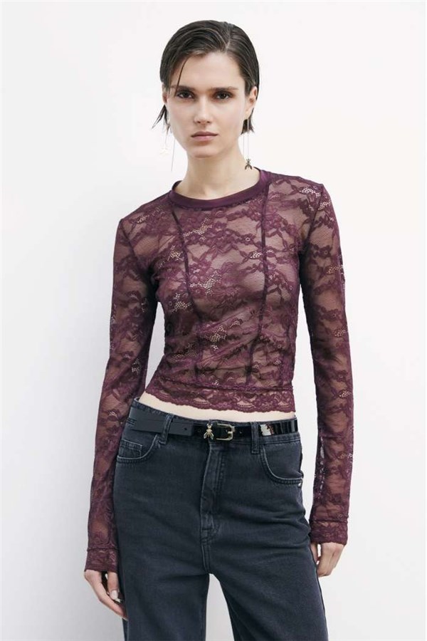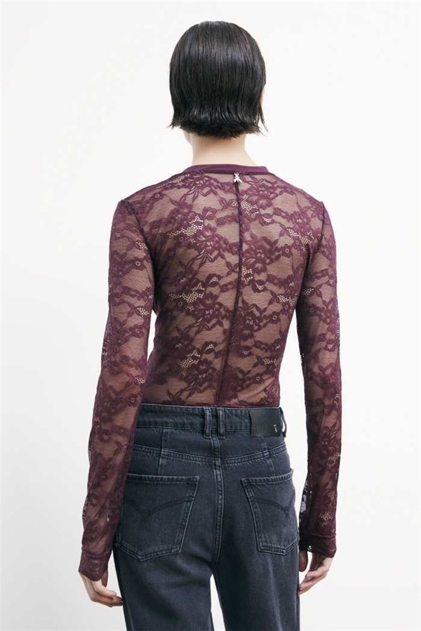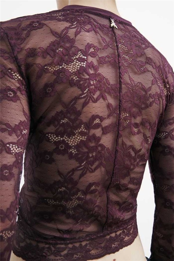 La maglietta a maniche lunghe in pizzo stretch avvolge il corpo come una seconda pelle. I bordi smerlati e i motivi floreali valorizzano l’effetto see-through, definito da cuciture stile corsetto. Il ciondolo Fly sul retro completa il design. Perfetta da indossare sotto un blazer o sotto il top coordinato, per look da cerimonia o layering sofisticati.