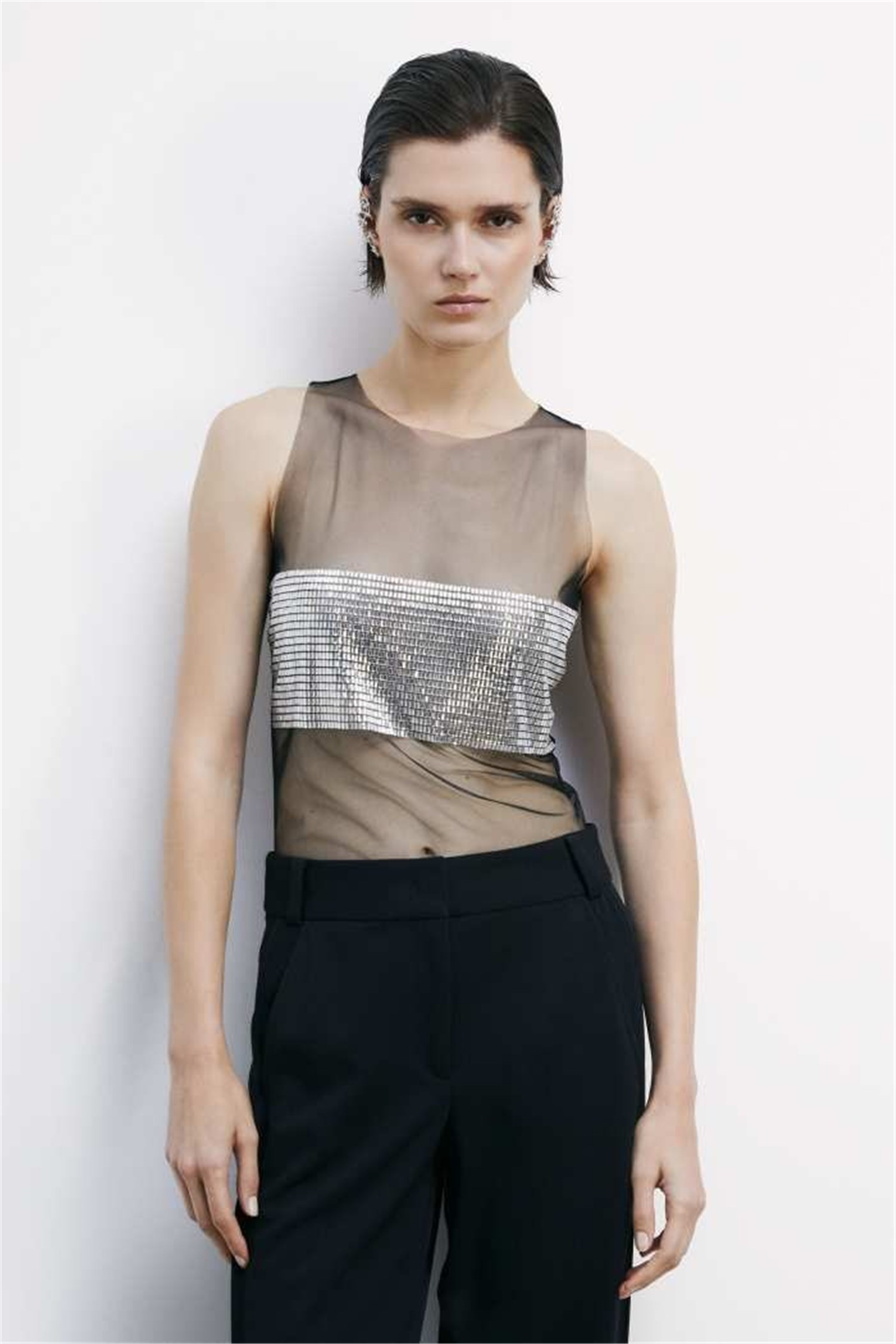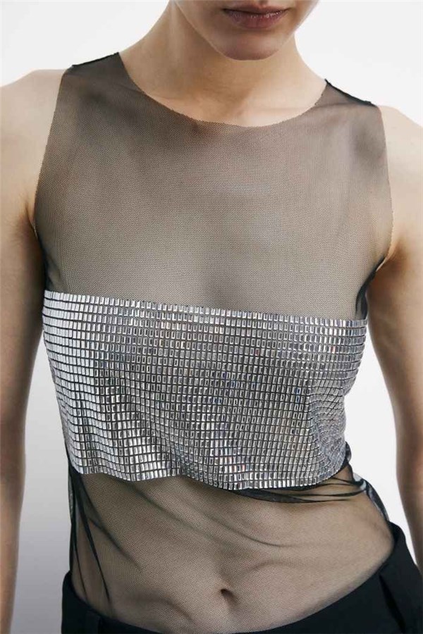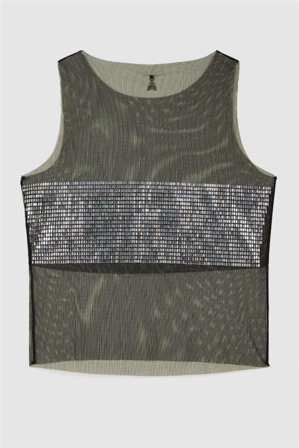 Parte della capsule Clubbing di Patrizia Pepe, il top in tulle con design a canotta si distingue per la fascia di strass effetto gioiello e il logo Fly sul retro del collo. Audace e sensuale nella sua trasparenza, è ideale con pantaloni fluidi e blazer dal taglio over per un look di contrasti.
