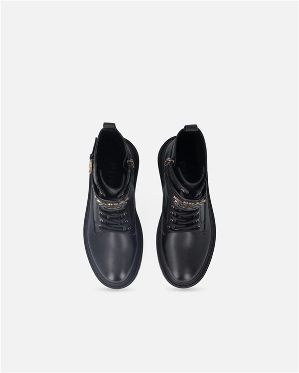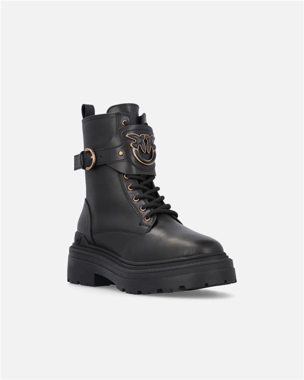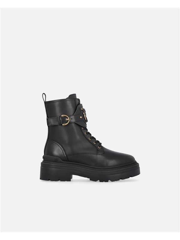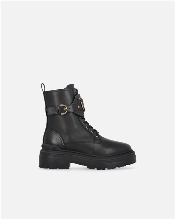 Stivaletti anfibi stringati al polpaccio caratterizzati da un cinturino regolabile con fibbia arricchito sul davanti dal logo Love Birds con profili metallici. Il modello, realizzato in pelle, è dotato di una zip sul lato interno del gambale e di un passante posteriore per facilitare l'indosso. È completato da una suola carrarmato in gomma con tacco 5,5 cm, fodera e soletta in pelle. Gli anfibi sono l'ideale per conferire ai tuoi look casual un tocco di audacia in più.