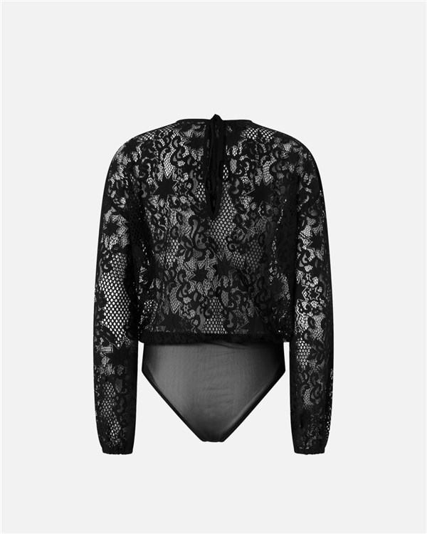 Body femminile a maniche lunghe in pizzo rebrodè semitrasparente decorato da un elaborato disegno. Chiusura a goccia con laccetti da annodare nel centro dietro. Abbina il body alla gonna longuette in pizzo nello stesso colore per un total look femminile e audace.