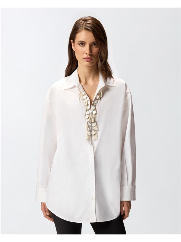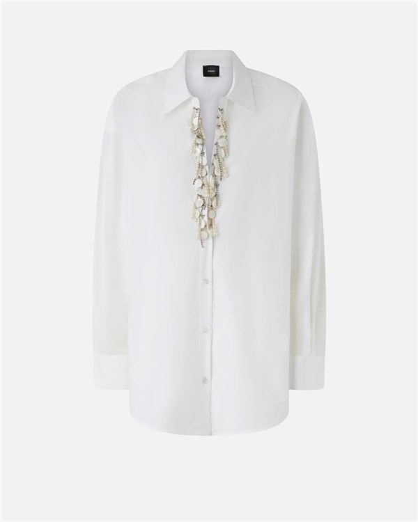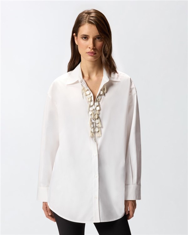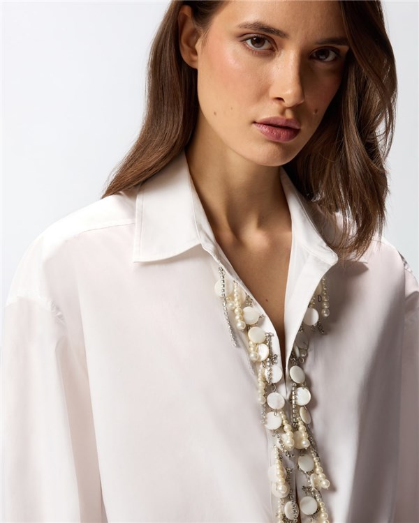Camicia classica dal volume leggermente oversize in popeline di puro cotone. Il colletto si apre in un profondo scollo a V decorato da un prezioso ricamo fatto a mano con applicazioni in vetro e catenelle metalliche con strass, cucite una ad una, che donano movimento e luce al capo. Il volume morbido e le maniche lunghe a giro leggermente basso completano lo stile di questa camicia, da abbinare con facilità a una minigonna e a una giacca stampata per creare un outfit quotidiano femminile e caratteristico.