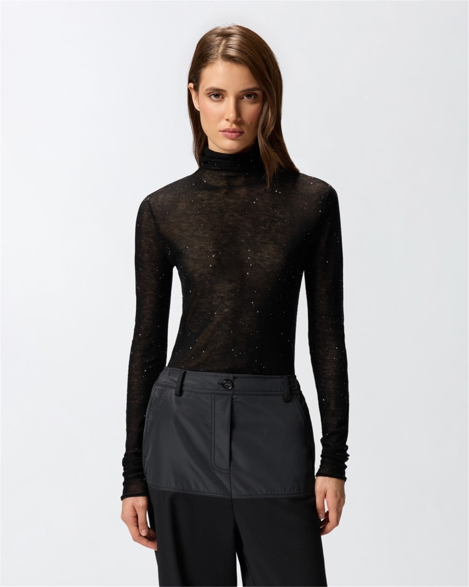 Maglia a maniche lunghe realizzata in misto lana semitrasparente: un filato leggero e morbido, quasi impalpabile, che contribuisce a creare un look sensuale e originale. Il design è impreziosito da micro paillettes inserite nel filo e riesce nell'impresa di risultare luminoso e al tempo stesso essenziale e molto comodo all'indosso. La linea aderente della maglia a collo alto è completata dall'etichetta logata nel centro dietro. Il capo è stato sottoposto a prove di finissaggio per ridurre al minimo la possibile formazione di pilling, garantendo una maggiore morbidezza e durabilità del tessuto.