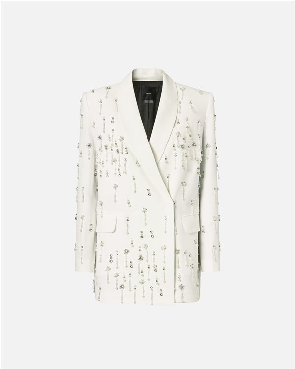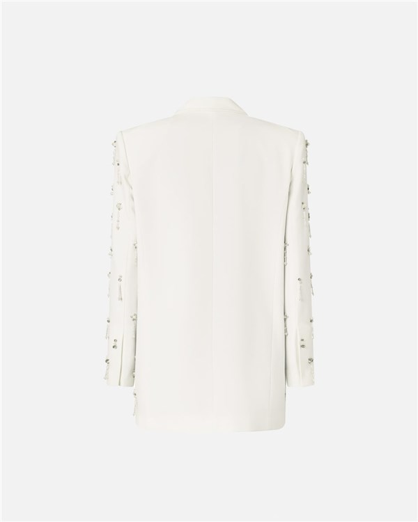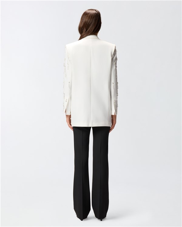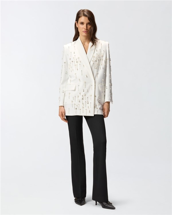 Blazer dalla vestibilità dritta con bottone invisibile, tasche sul davanti e taschino sul petto, realizzato in pregiato tessuto di poly viscosa. Perfetta unione di eleganza e artigianalità, questo modello è decorato da ricami con cristalli scintillanti e perle sulla parte frontale e sulle maniche: oltre a donare una luminosità senza pari, aggiungono un movimento fluido e contemporaneo. La vestibilità elegante e la finitura curata in ogni minimo dettaglio fanno di questa giacca un pezzo unico, ideale per serate speciali e occasioni di alta classe.