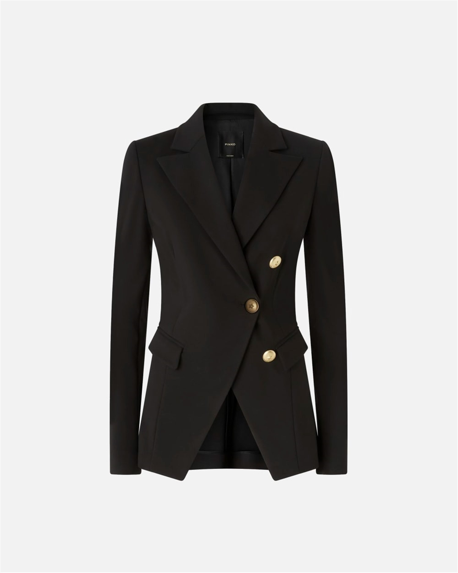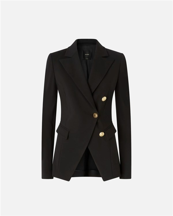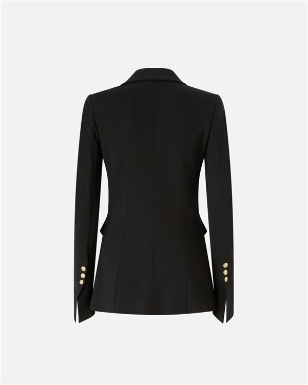 Giacca blazer elegante da donna realizzata in tessuto tecnico di viscosa stretch lavorato a punto stoffa, una speciale lavorazione che conferisce al tessuto una texture compatta e liscia. La vera protagonista del design è però la chiusura con bottoni decorati da stella, disposti in maniera tale da creare un particolare effetto di abbottonatura doppiopetto asimmetrica. Il capo presenta il carré posteriore foderato per garantire comfort e migliorare l'indosso, mentre il resto dell'interno è sfoderato per sfruttare al massimo il movimento del tessuto. Il modello presenta una vestibilità sfiancata, più aderente sui fianchi. Abbina il blazer con il pantalone nello stesso tessuto per un effetto tailleur, oppure indossa una camicia per un look formale, ma non troppo.