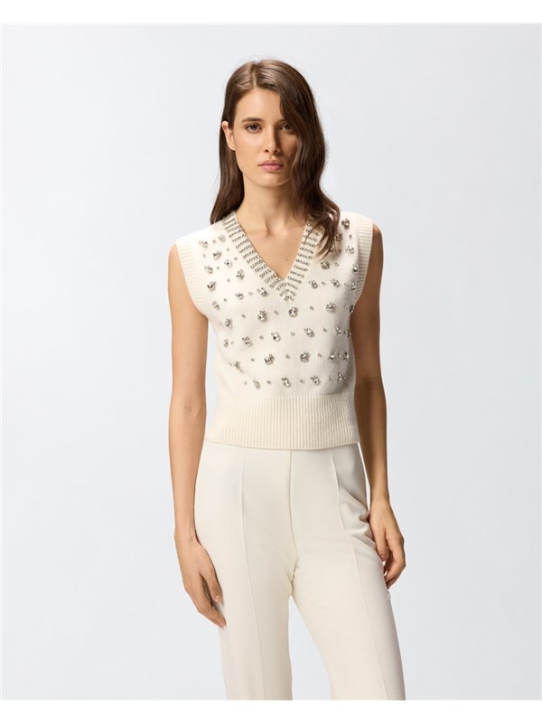 Gilet in maglia di misto lana con scollo a V, perfetto per le giornate in ufficio e non solo. L'orlo e il giromanica sono lavorati a coste, mentre il capo è completato dall'etichetta tono su tono con logo lettering PINKO sul retro. Il capo è stato sottoposto a prove di finissaggio per ridurre al minimo la possibile formazione di pilling, garantendo una maggiore morbidezza e durabilità del tessuto. Il design è immediatamente riconoscibile grazie agli strass di diverso tipo: ricamati con rigore sullo scollo, mentre sul resto del modello sono caratterizzati da diverse dimensioni e forme geometriche per un tocco inaspettato.