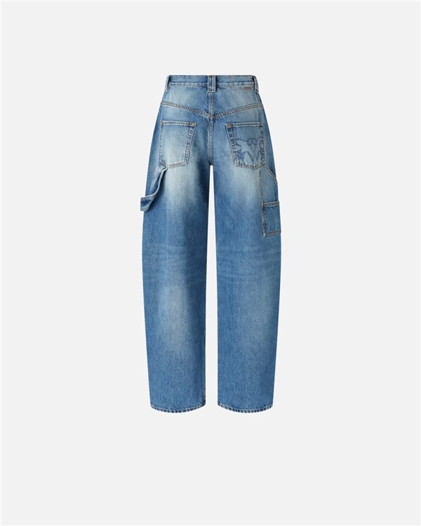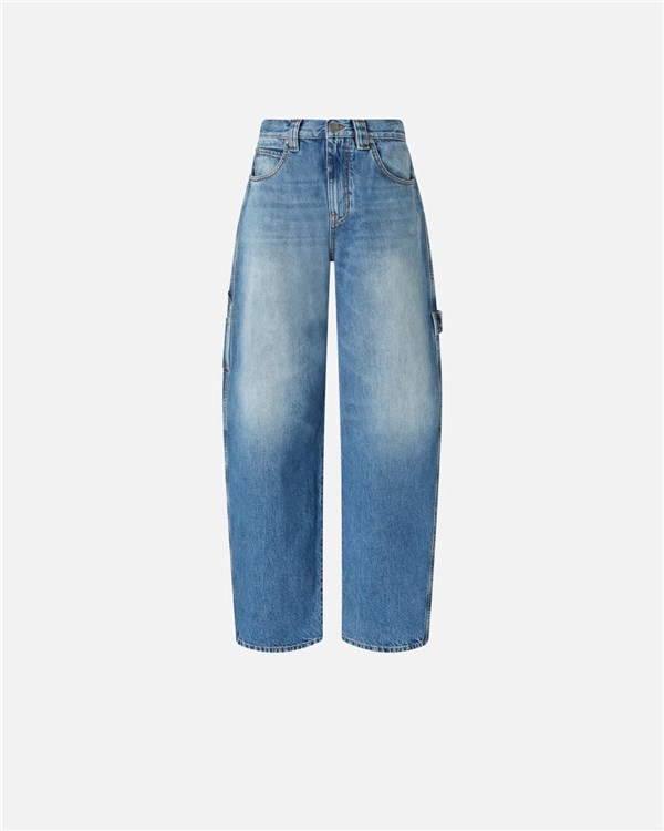 Jeans balloon-fit con gamba a palloncino morbida e arrotondata nella parte superiore e più stretta al fondo. Il modello è realizzato in denim blu di cotone ed è trattato con tecniche particolari per ottenere un effetto vintage e per creare accattivanti contrasti di colore. A personalizzare il design in puro stile PINKO troviamo il logo lettering del brand ricamato sul retrocinta, il logo Love Birds con uccellini ricamati sulla tasca posteriore destra e il rivetto con logo Love Birds sul quinto taschino. Completa il tuo guardaroba con questi jeans cinque tasche d'ispirazione workwear, dotati di doppia tasca su una gamba e di cinturino posteriore sull'altra. Vita regular con passanti per cintura, chiusura con zip e bottone a chiodo in metallo.
