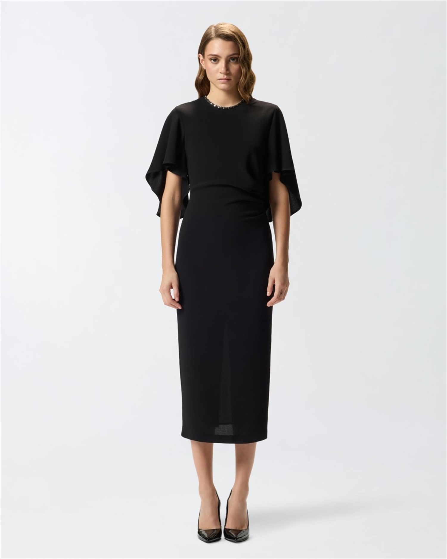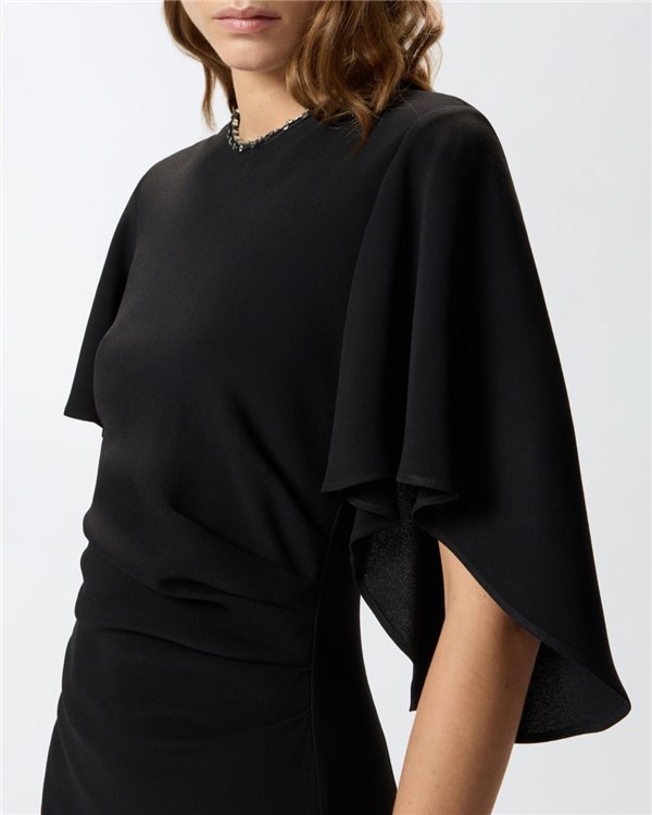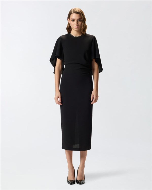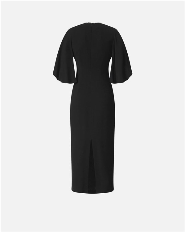 Vestito lungo foderato con silhouette aderente a tubino, ampie mezze maniche più lunghe dietro e scollo tondo, impreziosito da castoni e paillettes ricamate a mano. La linea dell'abito segue ed esalta le forme del corpo, con spacco centrale a fondo capo sul retro. Il tessuto in viscosa tecnica riesce a unire morbidezza e fluidità creando una texture sofisticata che offre comfort e vestibilità ottimali, senza perdere l'aspetto strutturato del design. Il materiale è progettato per aderire perfettamente alle linee del corpo, esaltando la silhouette in modo naturale e definito. I micro ricami di cristalli creano un contrasto di luci che esalta la texture del tessuto e dona movimento al look, senza perdere un effetto finale strutturato e femminile.
