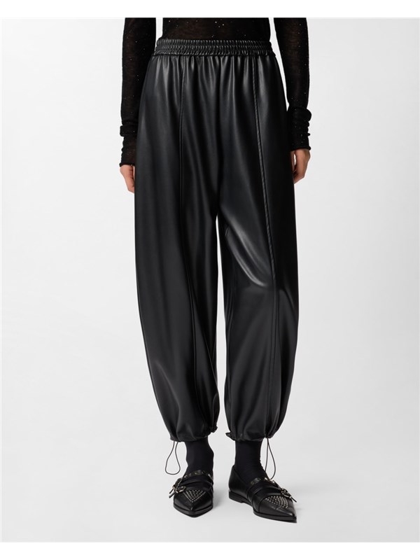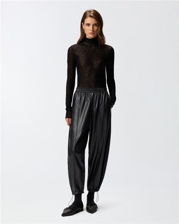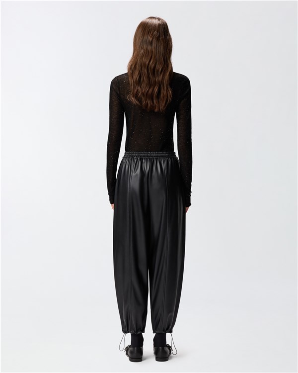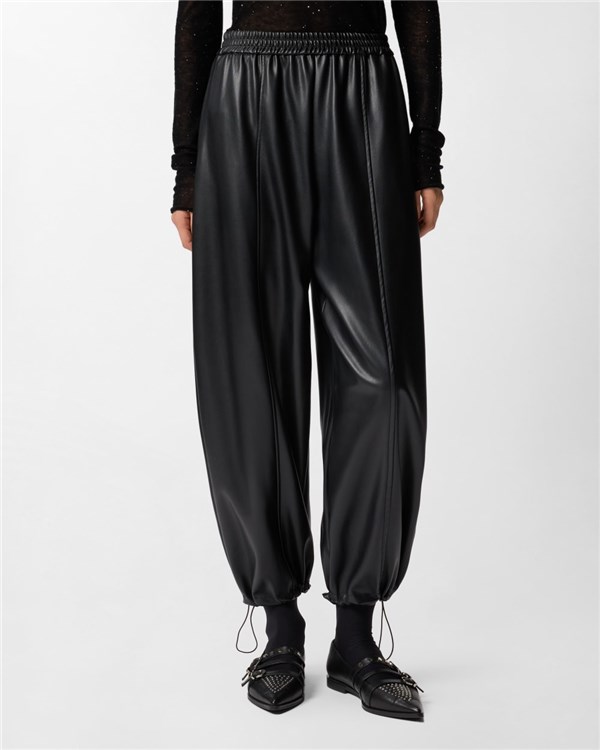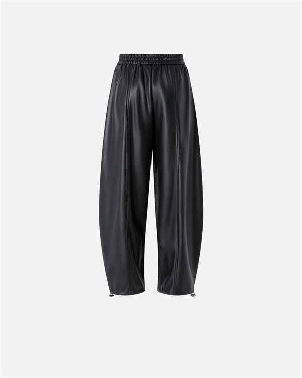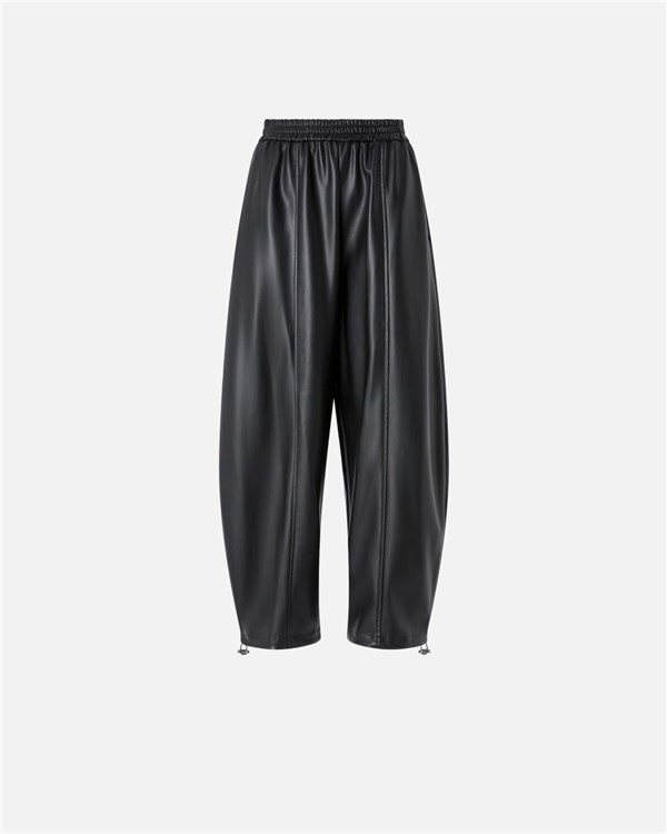 Pantaloni balloon-fit con gamba a palloncino morbida e arrotondata nella parte superiore e più stretta al fondo. Il modello è realizzato in un tessuto spalmato similpelle particolarmente leggero ed è dotato di una comoda vita elasticizzata. Il design può essere personalizzato grazie alla coulisse d'ispirazione trekking a fondo gamba che permette di creare un volume più o meno ampio. La fodera interna in tessuto mantiene il massimo comfort durante l'indosso.
