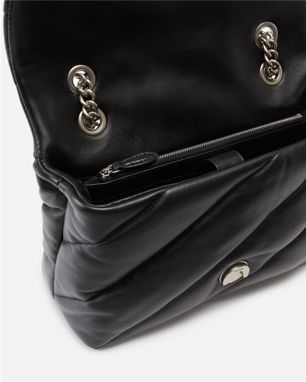 Classica borsa a tracolla Love Bag Puff in nappa morbida trapuntata con maxi pattern obliquo. La chiusura con patta è personalizzata con fibbia iconica in metallo Love Birds Diamond Cut. L'interno è foderato in tessuto scamosciato e include tramezza chiusa con zip e tasca a parete. Completa di tracolla che combina la classica catena metallica rotonda al pratico spallaccio in nappa.