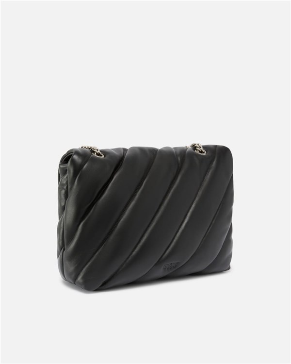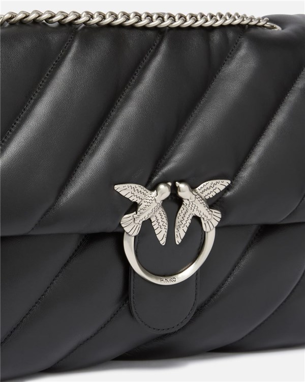 Borsa grande a tracolla Big Love Bag Puff in morbida nappa caratterizzata da maxi trapuntatura obliqua. La chiusura è completata dall'iconica fibbia in metallo Love Birds Diamond Cut. L'interno è foderato in microfibra scamosciata e comprende tramezza chiusa con zip e tasca a parete. La tracolla combina la classica catena metallica rotonda al pratico spallaccio in nappa.