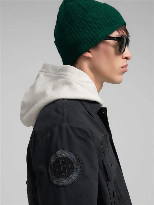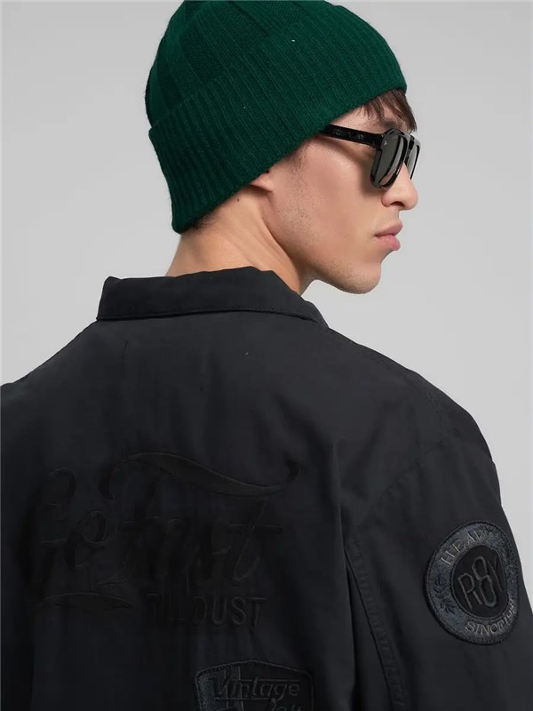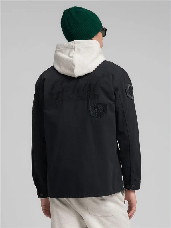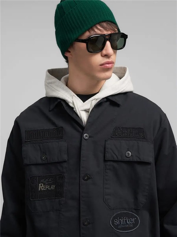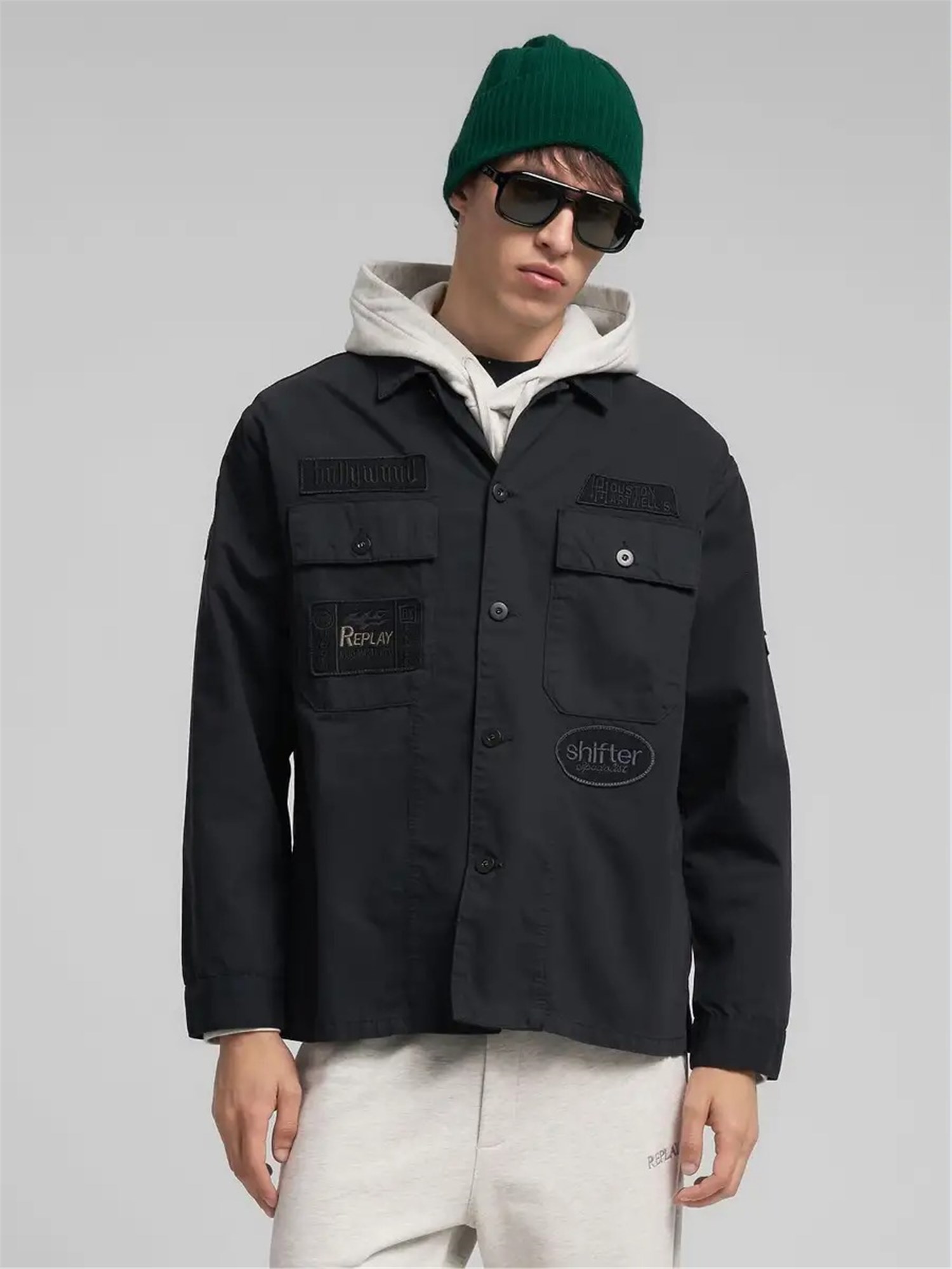 Giacca camicia dalla vestibilità regolare realizzata in twill di cotone tinta unita. Il modello è dotato di un classico colletto a punta, due tasche frontali con patta e bottone, polsini con doppio bottone e una chiusura con bottoni. Il capo si distingue inoltre per i numerosi patch con lettering ricamati in tono sul davanti, sulle maniche e sul retro e per il maxi lettering, anch'esso ricamato in tono, sul retro.