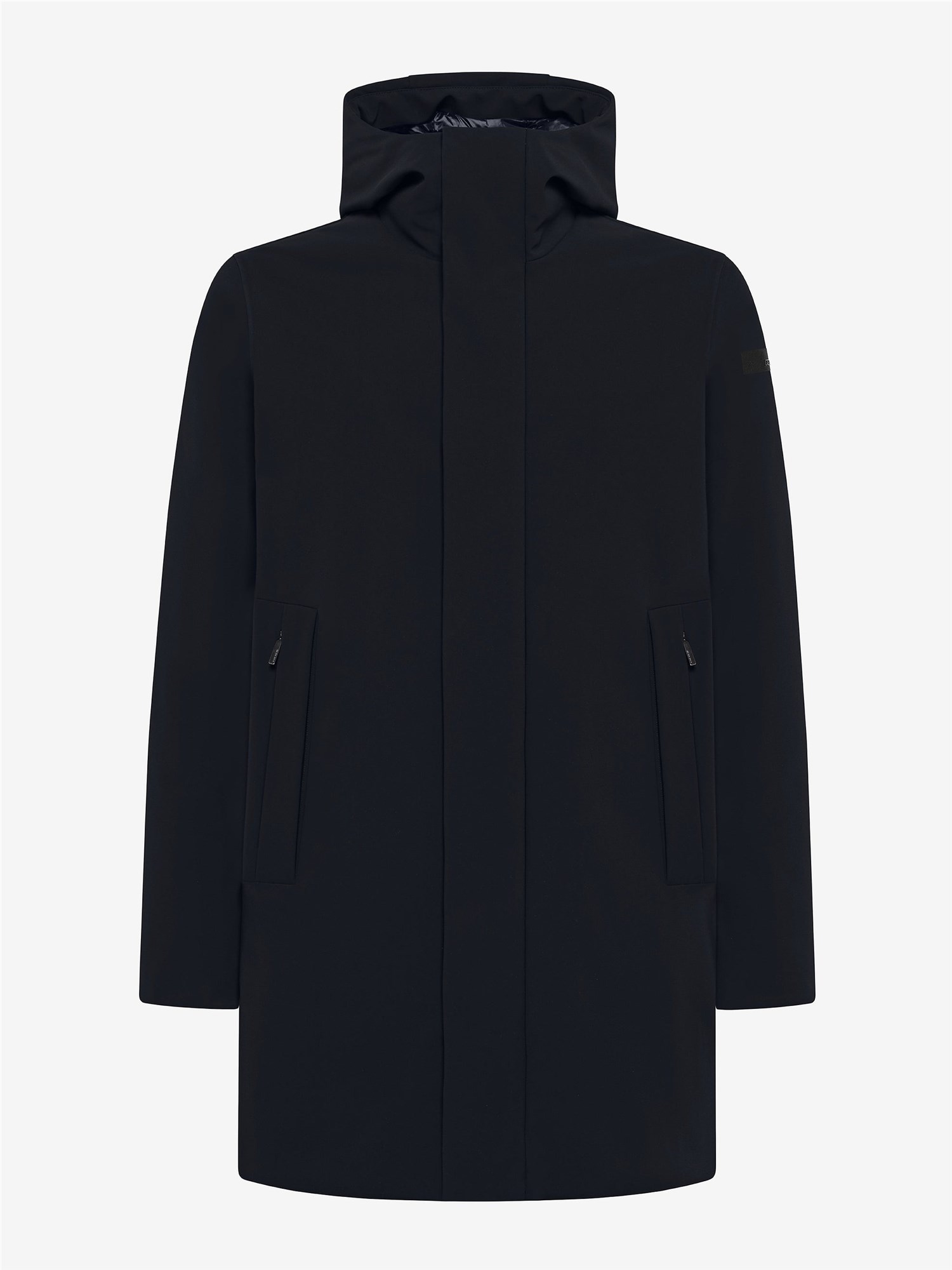 L'intramontabile design eskimo si trasforma in un capospalla prezioso, hi-tech e minimalista, che garantisce un alto livello di protezione dal freddo e dalle intemperie. Il modello leggero e confortevole è dotato di cappuccio fisso imbottito e presenta la costruzione in tessuto a membrana Stratofabric#3, impermeabile e traspirante. Il look super opaco dell'esterno nell'esclusivo tessuto stretch SURFLEX® esalta la nitidezza del design. La patta a bottoni metallici nasconde la chiusura a zip con doppio cursore, affiancata dalle pratiche tasche laterali a pistagna e zip invisibile. Il calore è assicurato dalla morbida e leggera imbottitura in piuma d'anatra 90/10, contenuta nei canali tubici che prevengono la fuoriuscita di materiale. L'interno presenta due tasche interne. Il logo a microiniezione nero sulla manica sinistra firma il capospalla con una nota iconica.