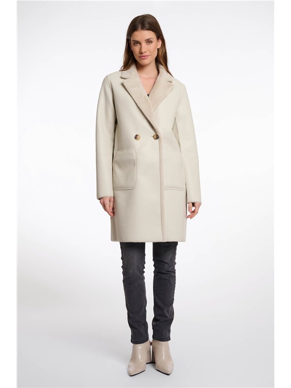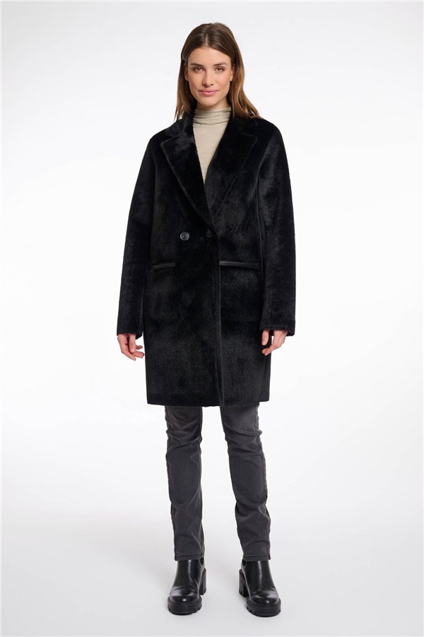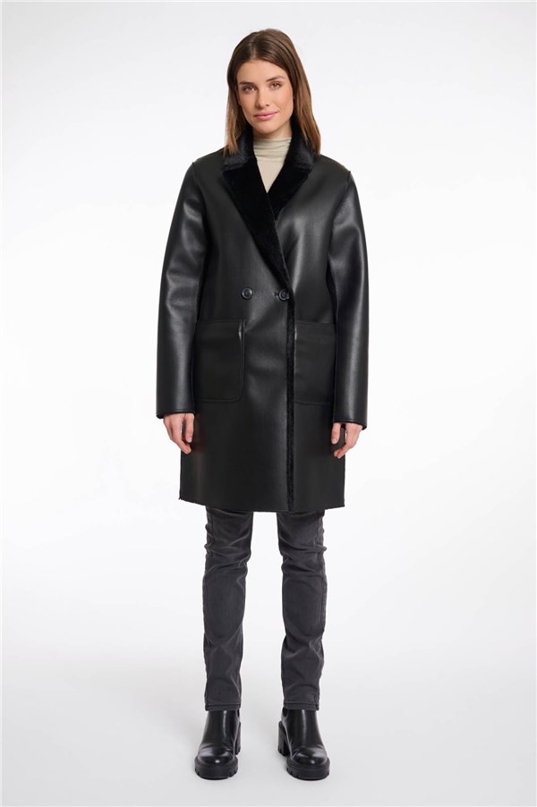 Cappotto da donna reversibile dal look femminile. Questo cappotto di media lunghezza può essere indossato in due modi. Il cappotto presenta una chiusura doppiopetto e un collo a revers. Da un lato, il cappotto è realizzato in ecopelle e presenta due tasche frontali aperte. L'altro lato è realizzato in lussuosa pelliccia sintetica e presenta due tasche frontali aperte con dettagli in ecopelle.