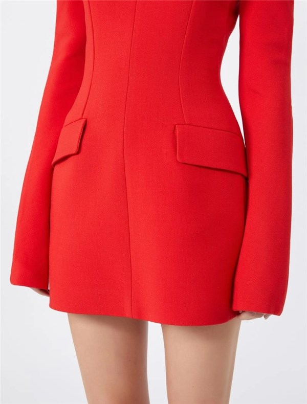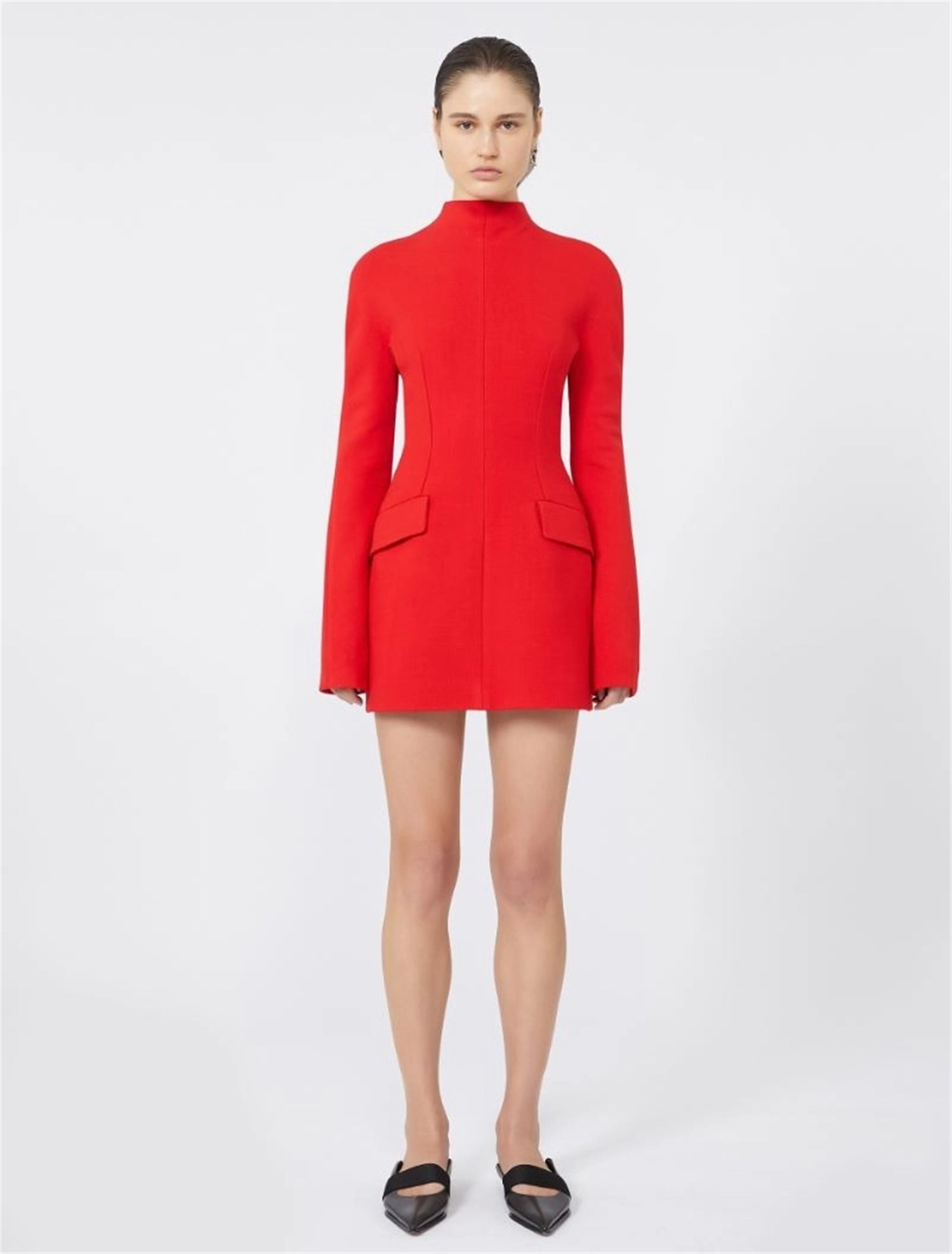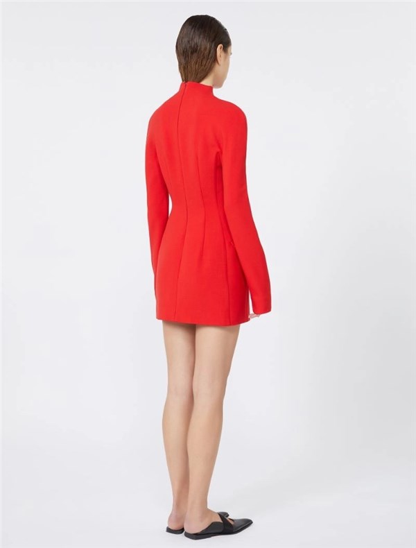 Abito corto dalla linea grafica, con sagomature che disegnano la silhouette enfatizzando i fianchi.