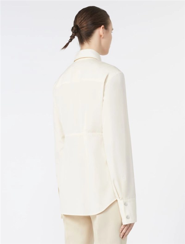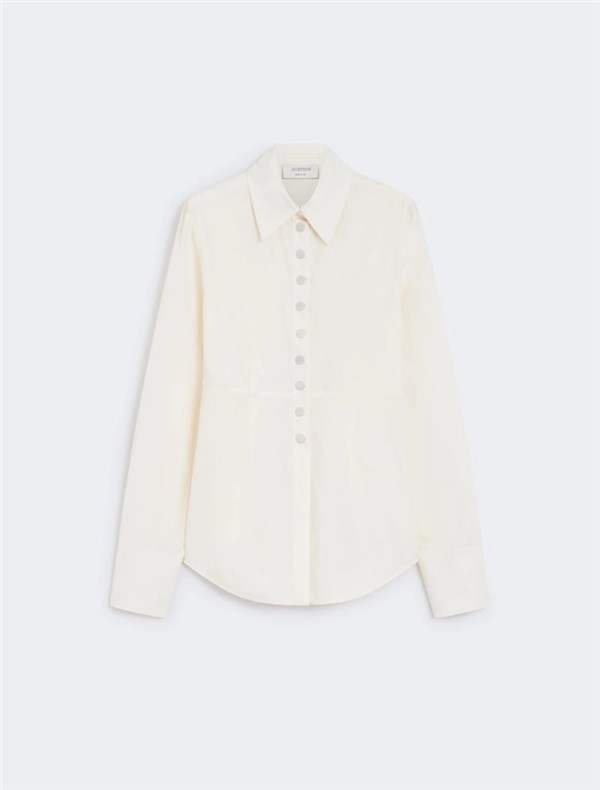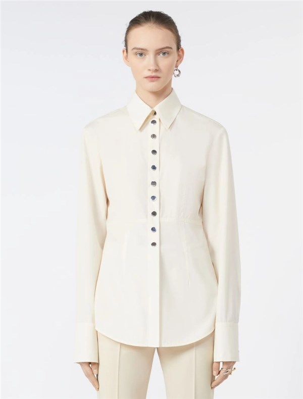 Camicia lunga realizzata in popeline di puro cotone, con fit aderente e linea femminile enfatizzata dal taglio in vita. Modello con bottoni metallici a pressione personalizzati e polso alto con sparato di ispirazione maschile.