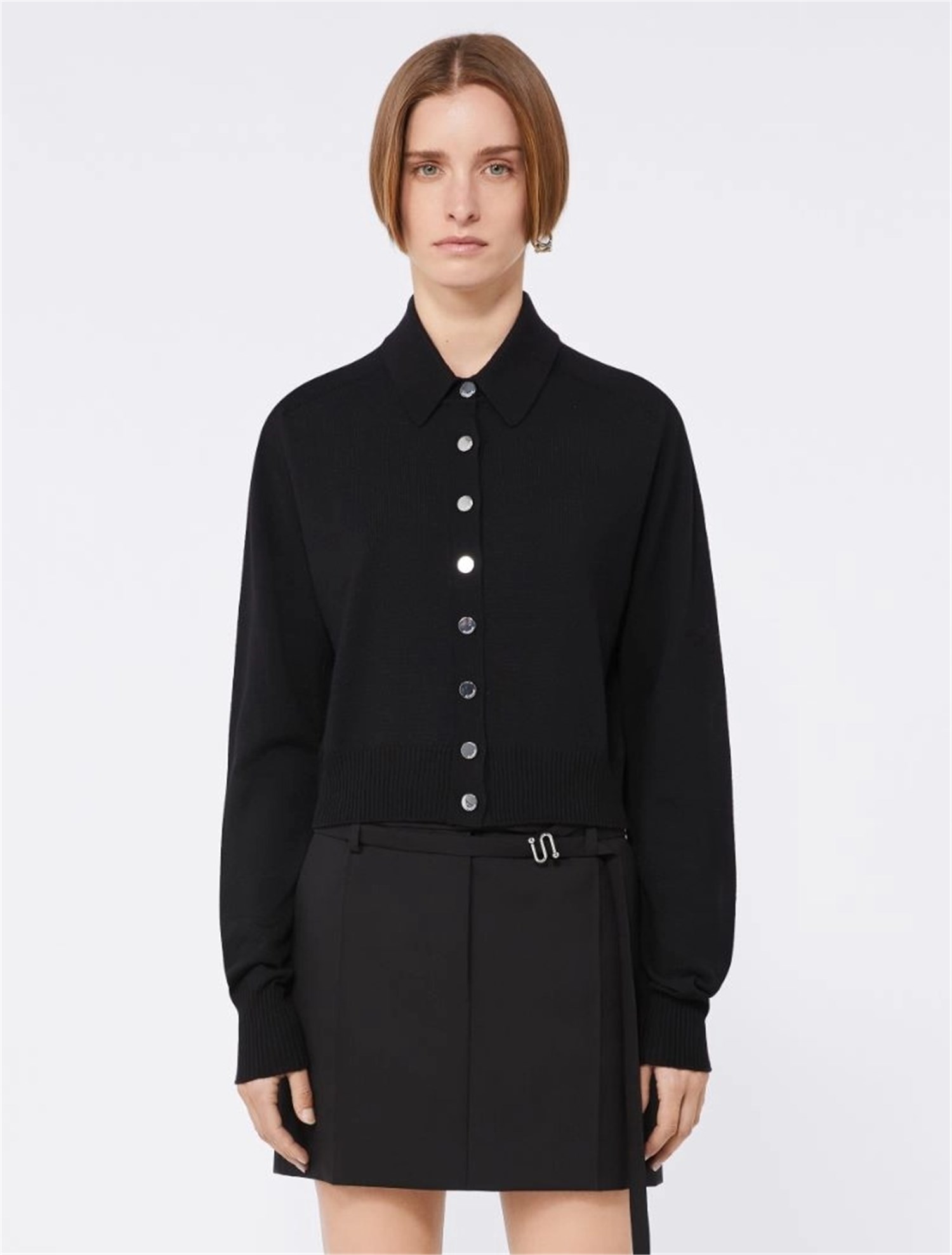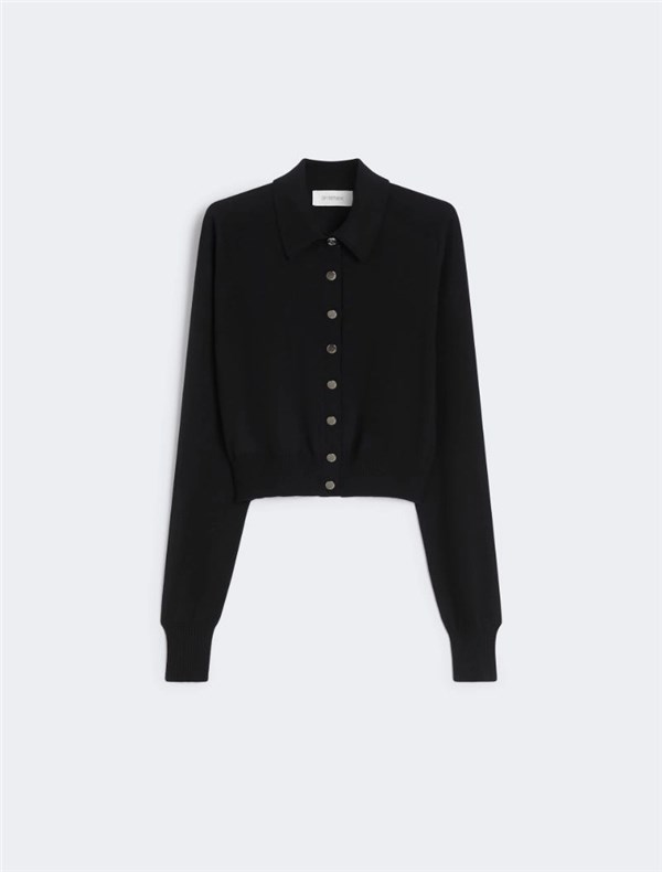Cardigan dalla linea femminile, con calature sulla spalla e collo a camicia. Chiusura con bottoni metallici personalizzati e bordi in maglia a costine.