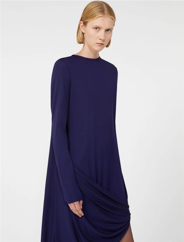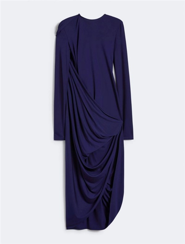 Costruzione innovativa e femminile per l'abito in jersey stretch, con pannello che avvolge la schiena e crea una morbida drappeggiatura sulla spalla.
