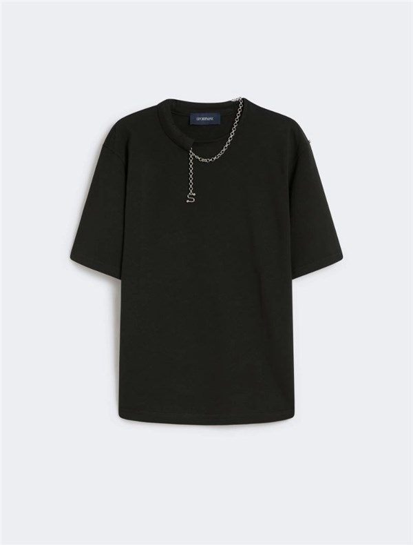 T-shirt dalla costruzione originale, con speciale scollatura che permette di inserire una collana con pendente personalizzato.