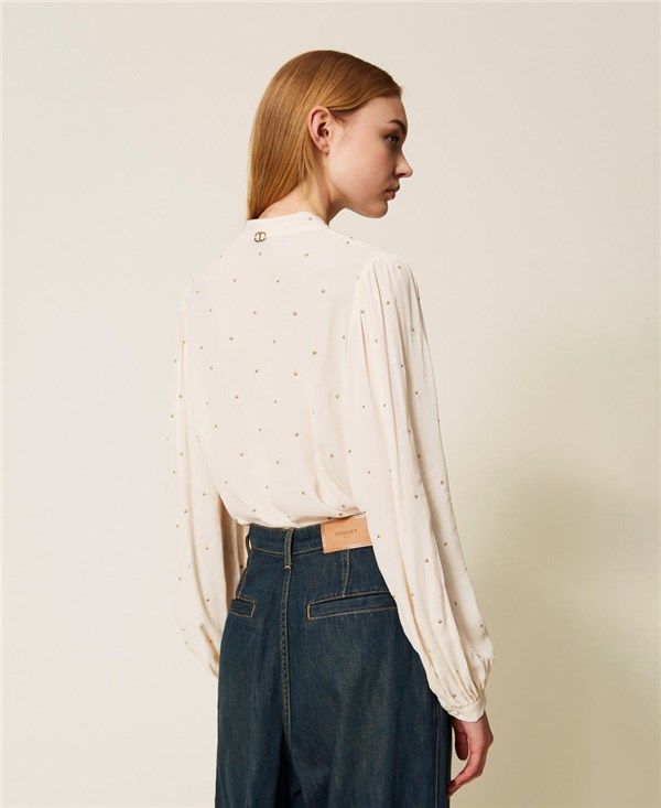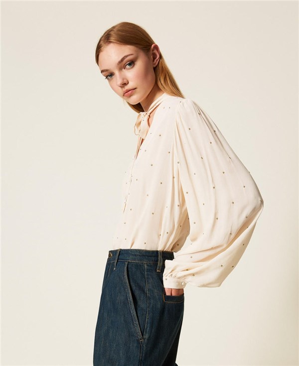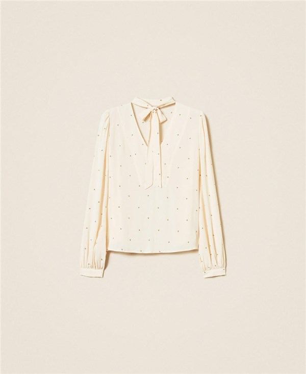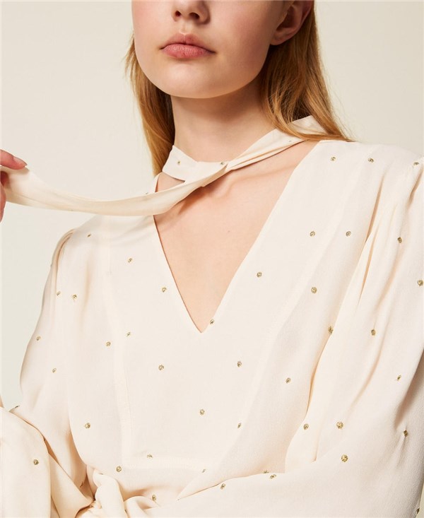Blusa in tessuto con ricamo a pois in lurex, scollatura a V davanti con nastri da annodare a fiocco, maniche lunghe con polsino e arricciatura al fondo, linea morbida.