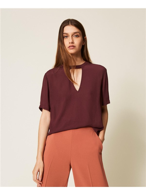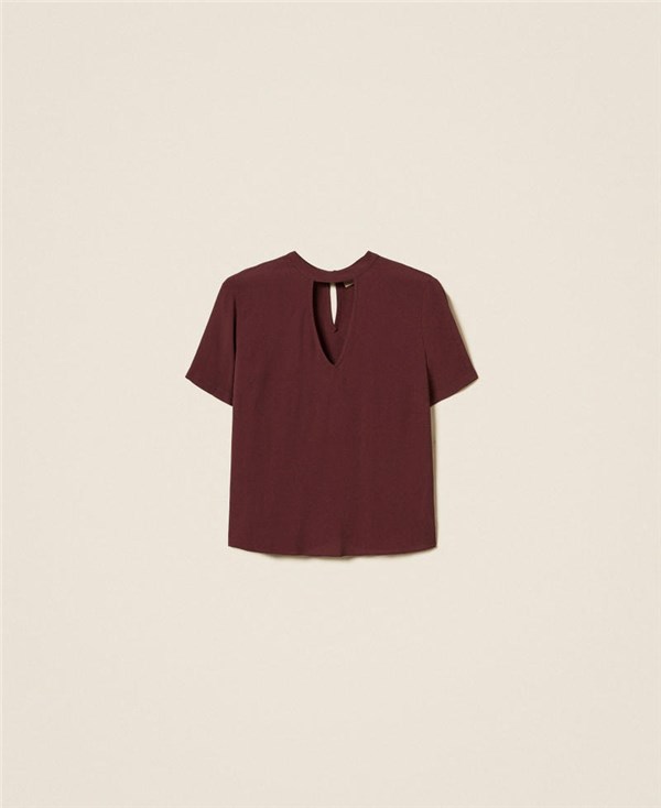 Blusa in crêpe de Chine con cut-out a V davanti. Ha collo tondo, maniche corte, apertura a goccia con bottone ricoperto sul retro, linea morbida.
