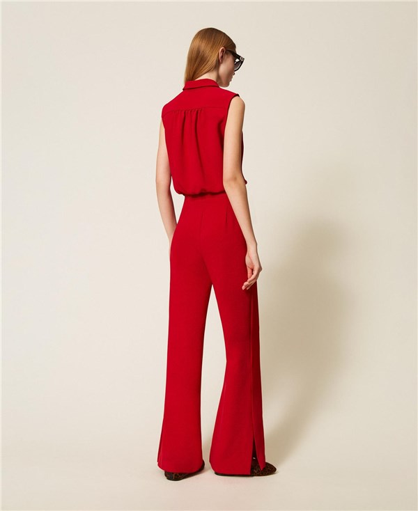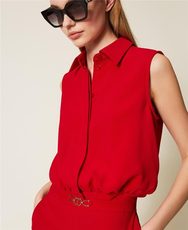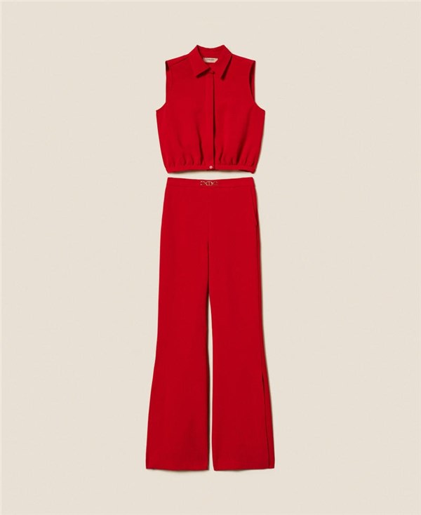 Completo in crêpe cady composto da blusa e pantaloni a palazzo. La blusa è smanicata, con colletto a camicia, chiusura con bottoni nascosti, linea morbida. I pantaloni hanno una fibbia logati davanti con Oval T e chiusura con zip al fianco. Puoi indossare il completo come una tuta intera allacciando in vita blusa e pantaloni con bottoni nascosti.