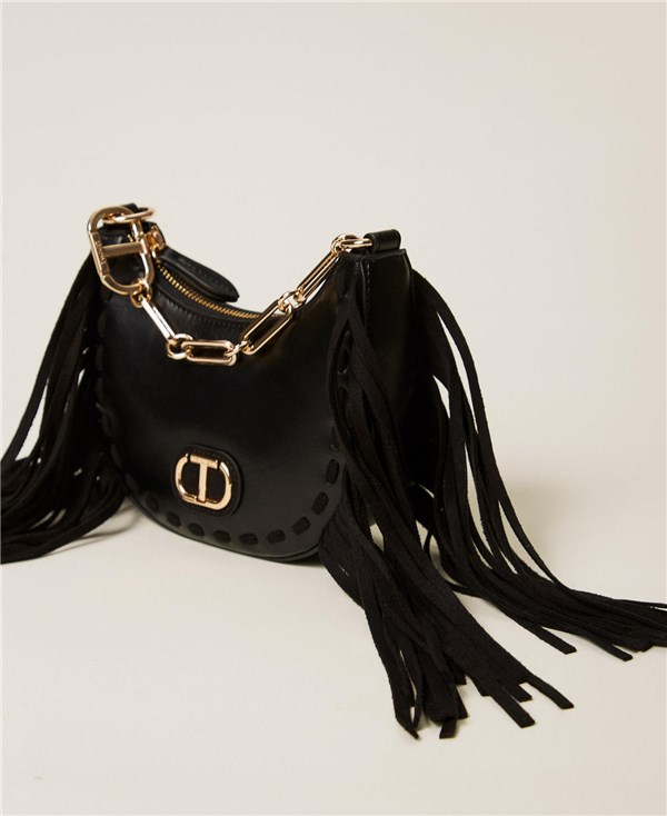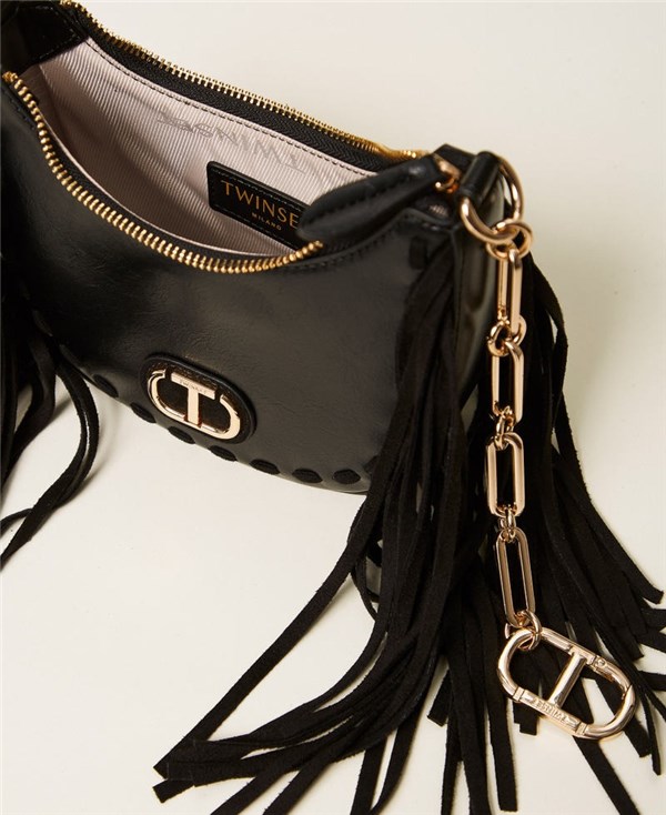 Borsa hobo mini 'Melrose' effetto vacchetta naturale lucida con frange morbide in microfibra in tinta effetto suede. Ha chiusura con zip, manico a mano in catena con personalizzazione Oval T in metallo, profilo con infilatura in tono, logo davanti in metallo, foderata.