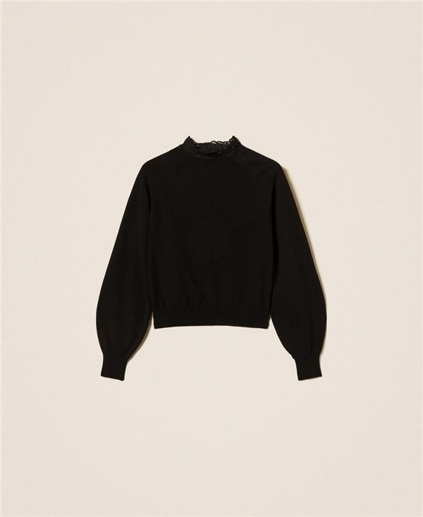 Maglia lupetto in misto viscosa con lavorazione rasata e applicazione di passamaneria in pizzo che rifinisce il collo. Ha maniche lunghe morbide, apertura a goccia con bottoni sul retro, linea morbida.