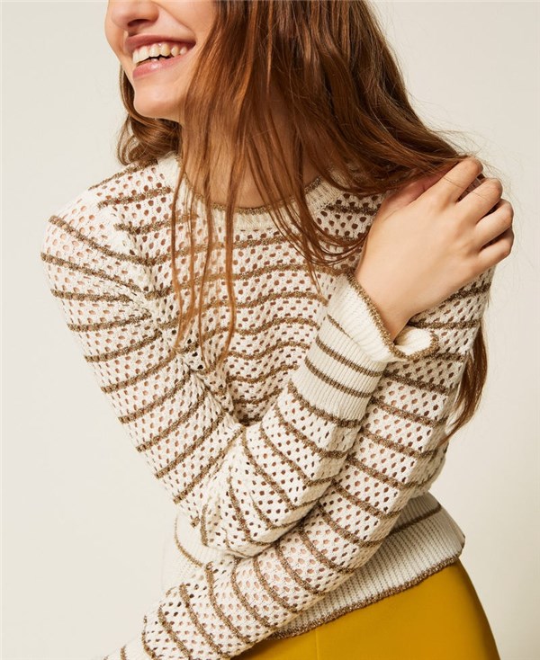 Maglia in misto cotone e viscosa con lavorazione punzonata effetto rete bicolore in filato lurex a righe. Ha collo tondo, maniche lunghe, fondi rifiniti da volant, linea morbida.