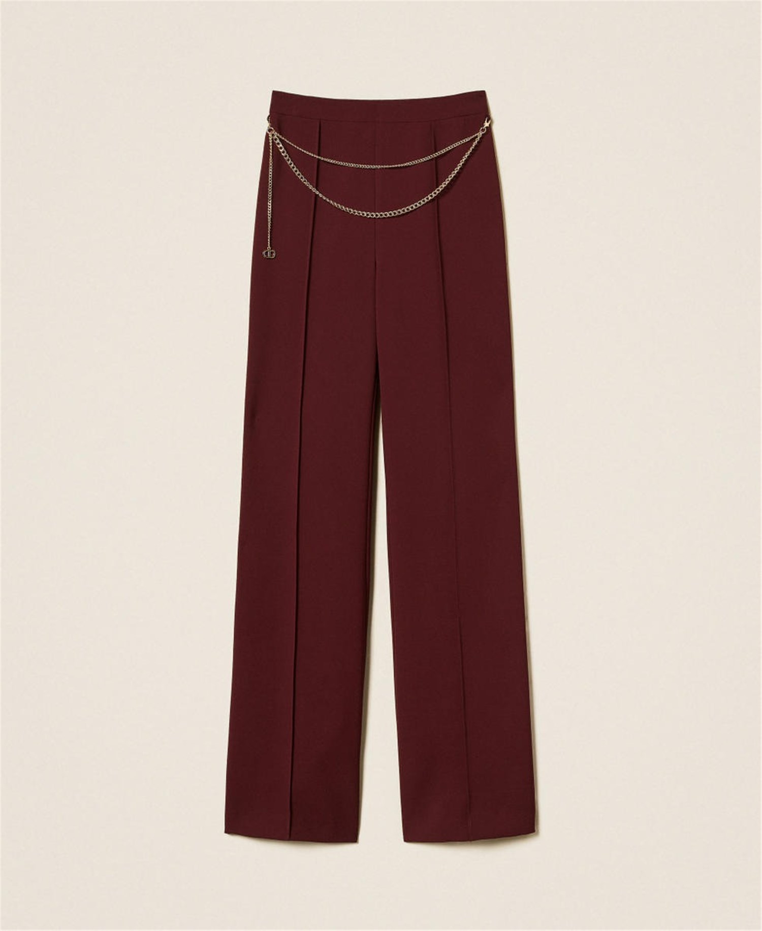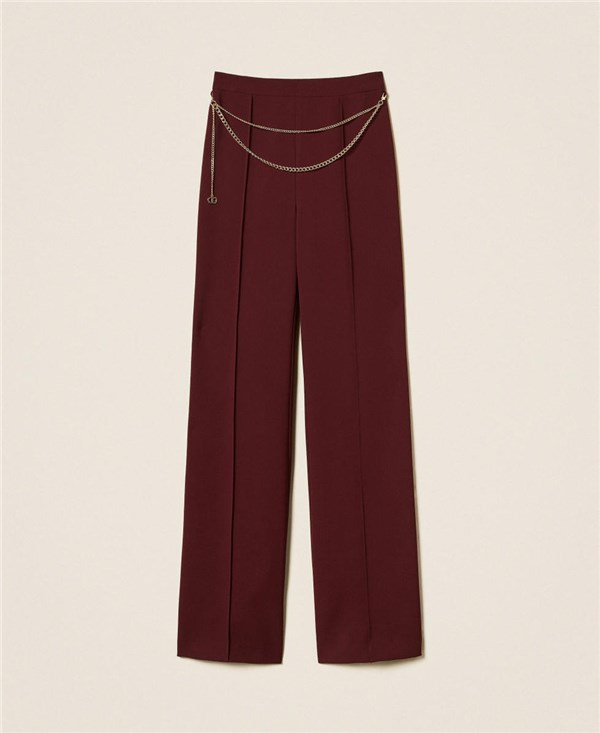 Pantaloni in crêpe cady con cintura rimovibile in catena davanti e dettaglio Oval T. Ha chiusura con zip invisibile al fianco, nervatura centrale, linea a palazzo.