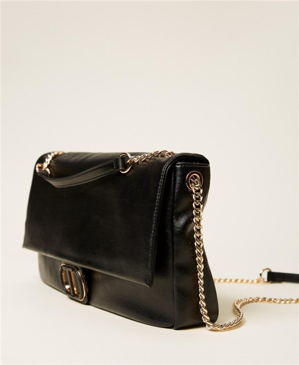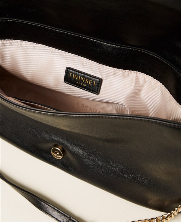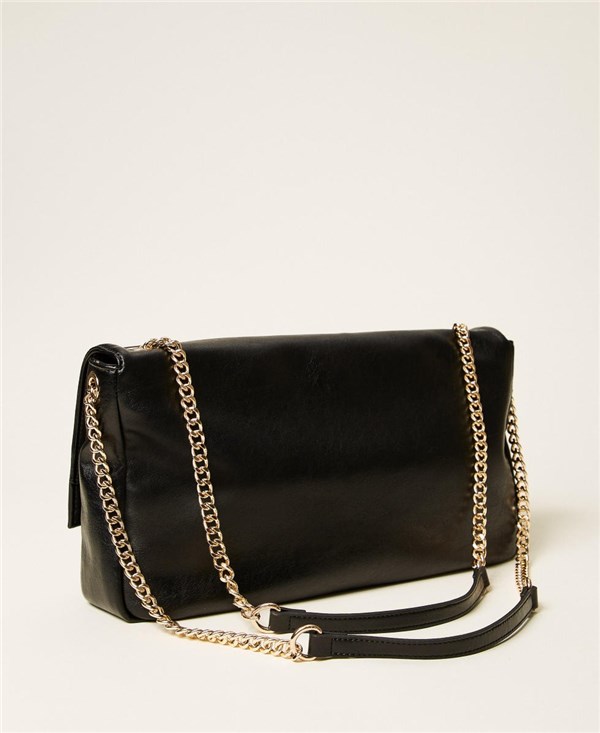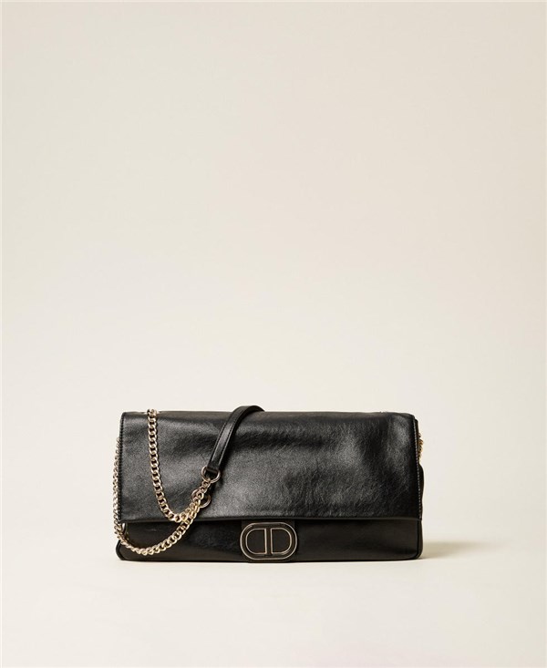 Borsa a tracolla morbida effetto pelle di vitello semilucido con superficie mossa e naturale. Ha chiusura con patta e magnete, logo Oval T verniciato effetto resina in tinta con base in metallo, tracolla in catena scorrevole con spallaccio. Foderata e con tasche interne.