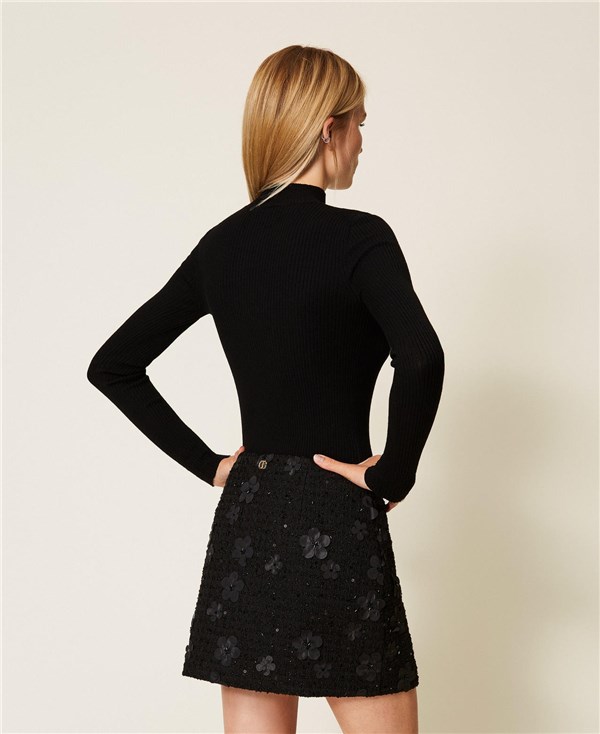 Minigonna in tessuto bouclé con applicazione di fiori e paillettes. Ha chiusura con zip al fianco, fodera, placchetta logo Oval T sul retro, linea fitted.