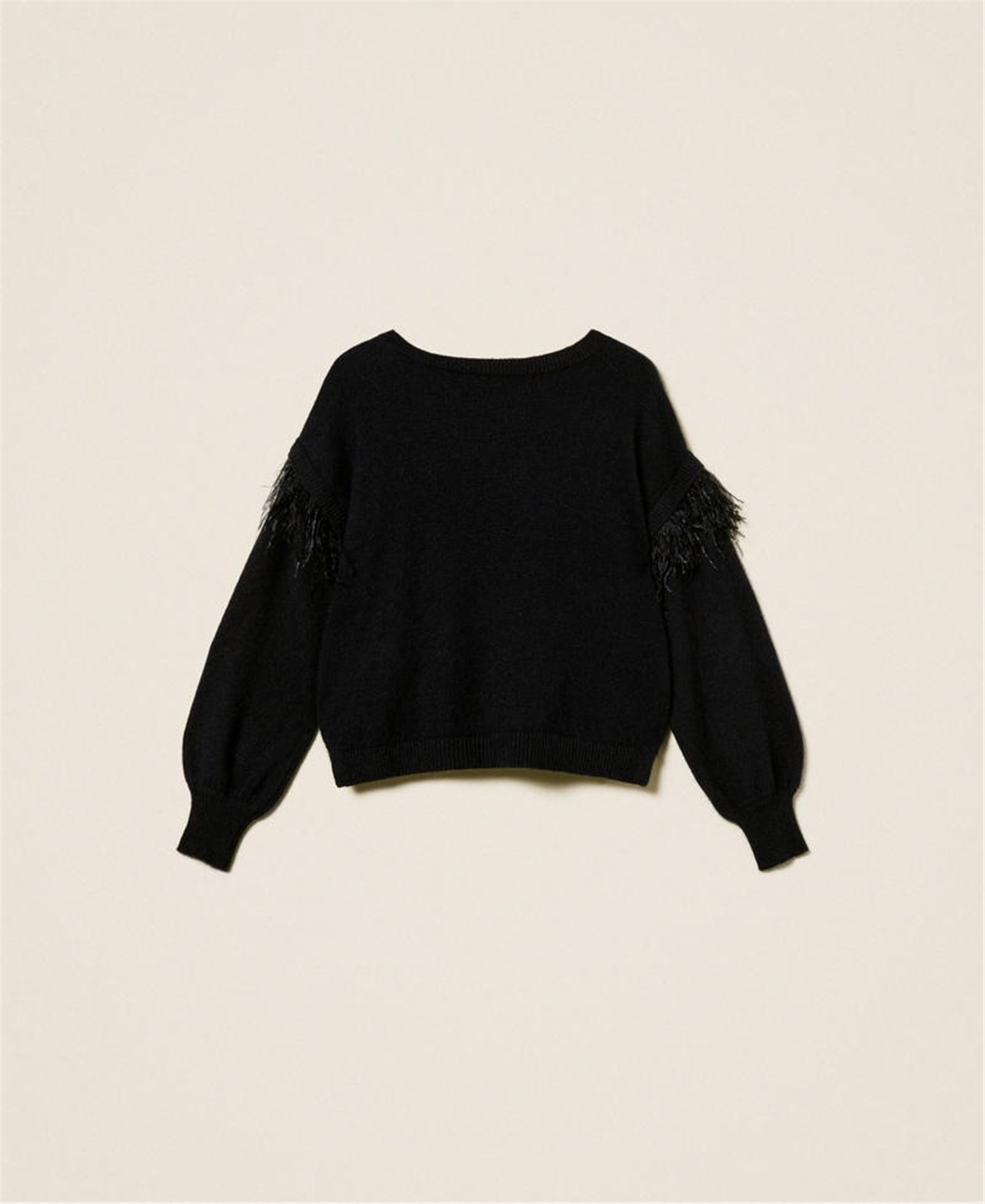Maglia in misto angora con spalle scese rifinite da bordi di piume rimovibili. Ha lavorazione rasata, collo tondo, maniche lunghe, spacchi laterali al fondo, profili rifiniti a coste, placchetta logo Oval T ricoperta in filo sul retro, linea ampia.