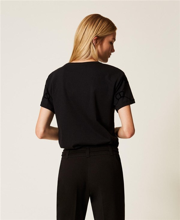 T-shirt in jersey di cotone con stampa floccata Oval T all over davanti e sulle maniche. Ha collo tondo, maniche corte con spalle leggermente scese, linea dritta.