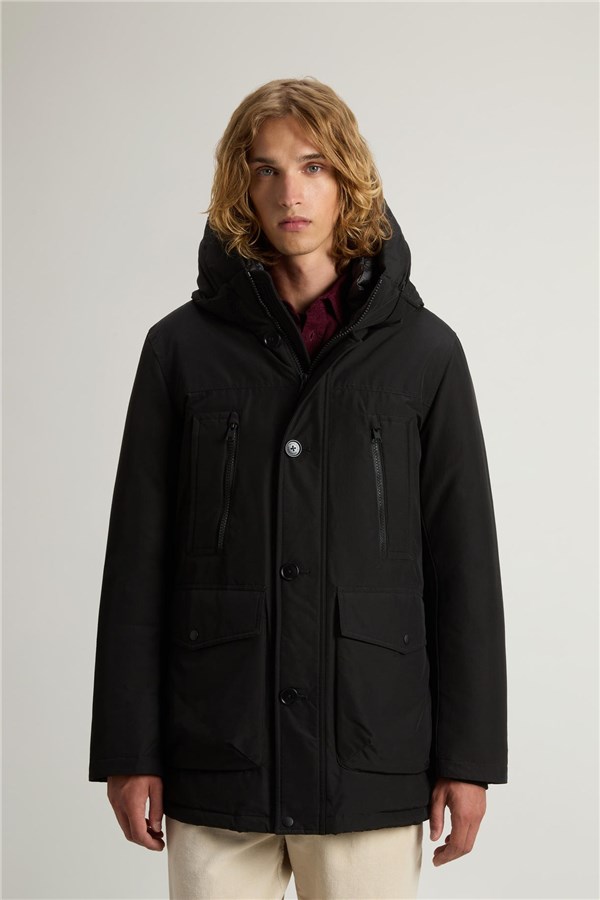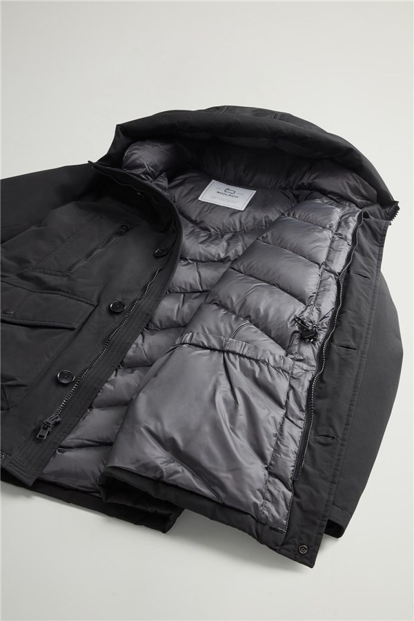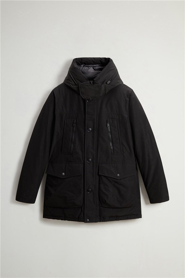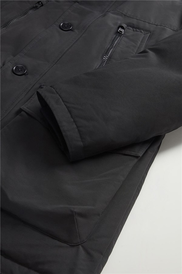Rivisitazione del nostro iconico Arctic Parka, questa nuova silhouette fa parte della capsule dei 5 Parka che giocano con le linee e i dettagli che hanno reso celebre questo modello, creando un ponte fra tradizione e contemporaneità. Realizzato nel nostro tessuto Ramar Cloth, resistente all'acqua e al vento, è imbottito in piuma d'anatra. Ha la chiusura con bottoni e zip nascosta, il cappuccio con una zip che permette di mostrare o nascondere la scritta Woolrich e una serie di tasche funzionali. Le due tasche superiori sono a doppio ingresso con zip e quelle sul fondo con patta e bottone a pressione. Internamente ha una coulisse per regolare la vestibilità e le due tasche tipiche del modello. I polsini a costine sono un ottimo alleato nelle giornate ventose.