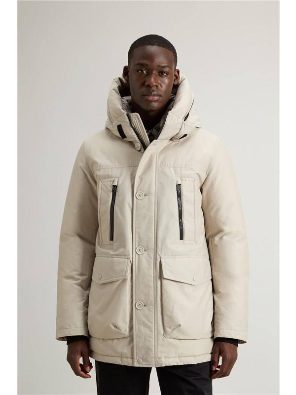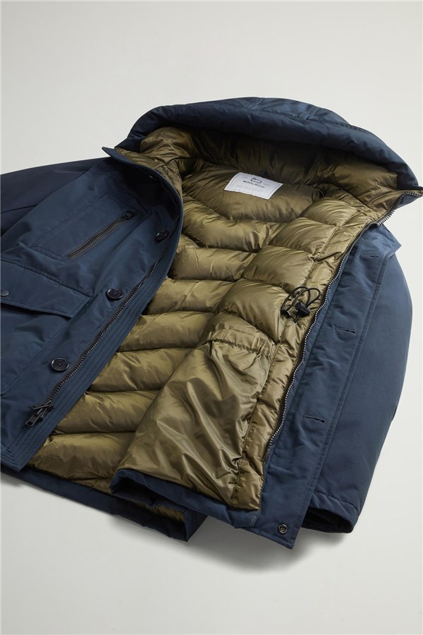 Rivisitazione del nostro iconico Arctic Parka, questa nuova silhouette fa parte della capsule dei 5 Parka che giocano con le linee e i dettagli che hanno reso celebre questo modello, creando un ponte fra tradizione e contemporaneità. Realizzato nel nostro tessuto Ramar Cloth, resistente all'acqua e al vento, è imbottito in piuma d'anatra. Ha la chiusura con bottoni e zip nascosta, il cappuccio con una zip che permette di mostrare o nascondere la scritta Woolrich e una serie di tasche funzionali. Le due tasche superiori sono a doppio ingresso con zip e quelle sul fondo con patta e bottone a pressione. Internamente ha una coulisse per regolare la vestibilità e le due tasche tipiche del modello. I polsini a costine sono un ottimo alleato nelle giornate ventose.