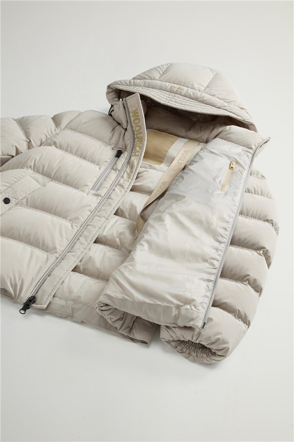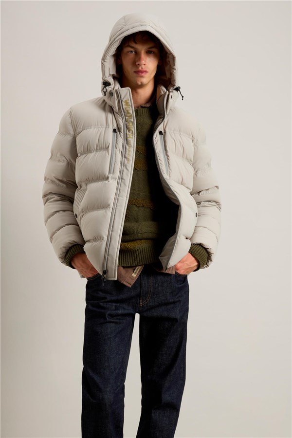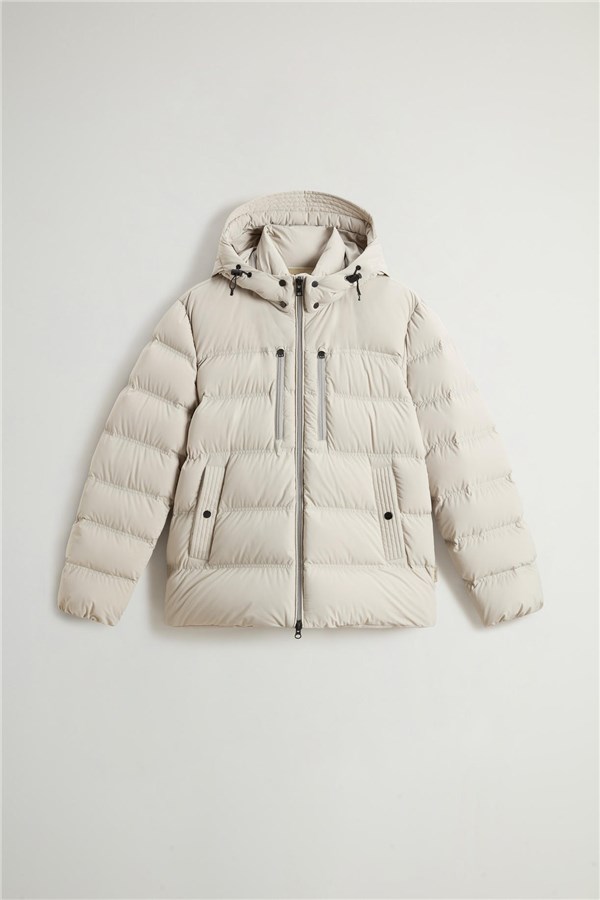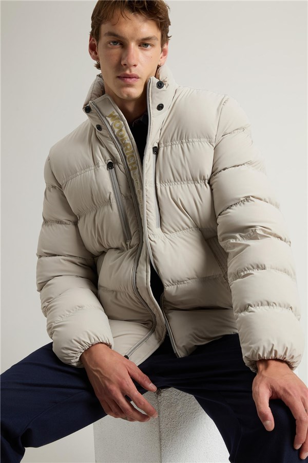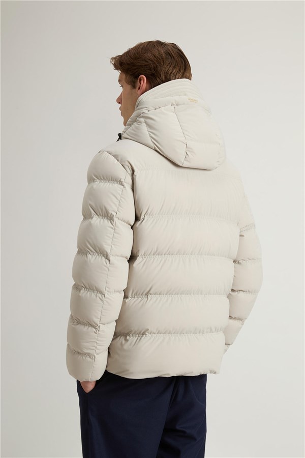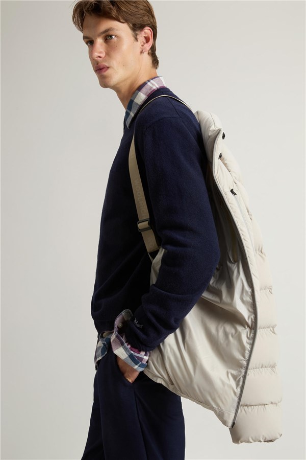 Un modello perfetto per la stagione fredda, pratico e avvolgente. Realizzato in nylon elasticizzato, questo piumino è idrorepellente, resistente al vento ed è imbottito in calda piuma d’anatra. Il modello presenta elementi funzionali come il cappuccio rimovibile, regolabile con fermacorda e dotato di visiera logata, la chiusura con zip bidirezionale e cinque tasche: due scaldamani con zip, due laterali a filetto con bottoni a pressione e una tasca interna con zip. Il collo alto assicura maggiore protezione, mentre la coulisse interna in vita migliora la vestibilità. Completano il modello le bretelle interne con logo, pensate per facilitarne il trasporto, e il logo sulla parte interna dell'abbottonatura, visibile solo quando il capo è aperto.